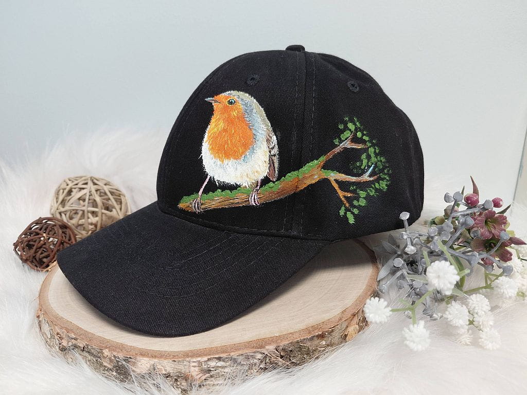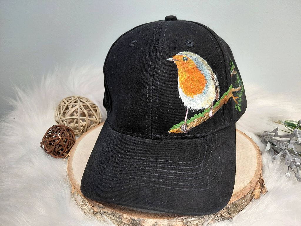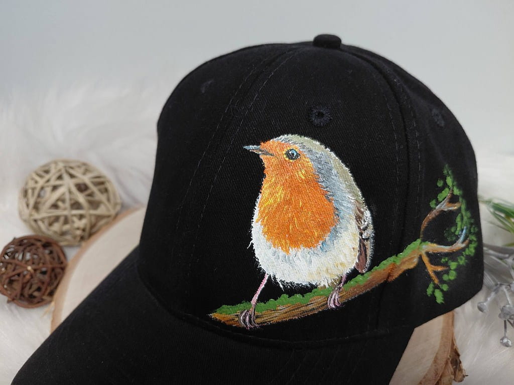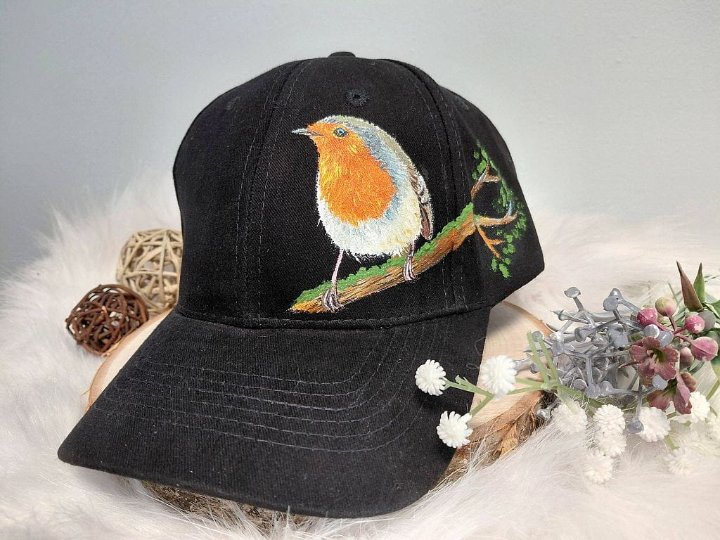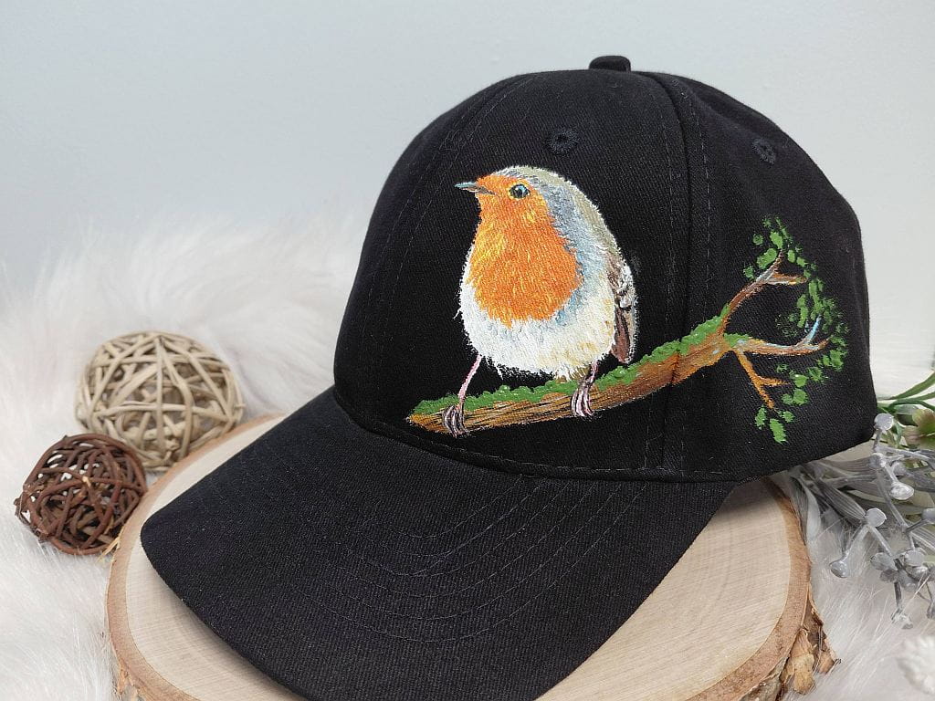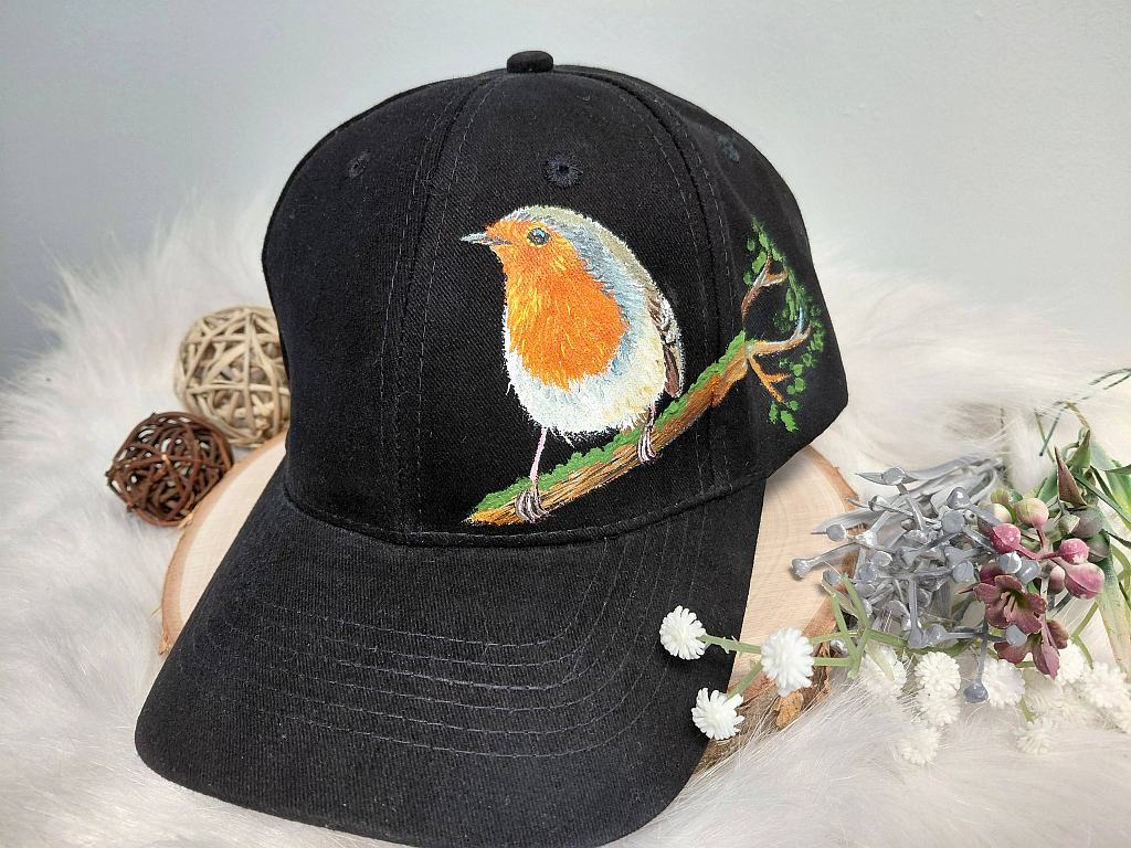 Wyjątkowa ręcznie malowana czapka z daszkiem Rudzik