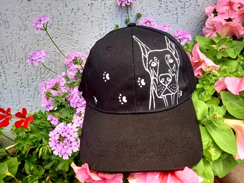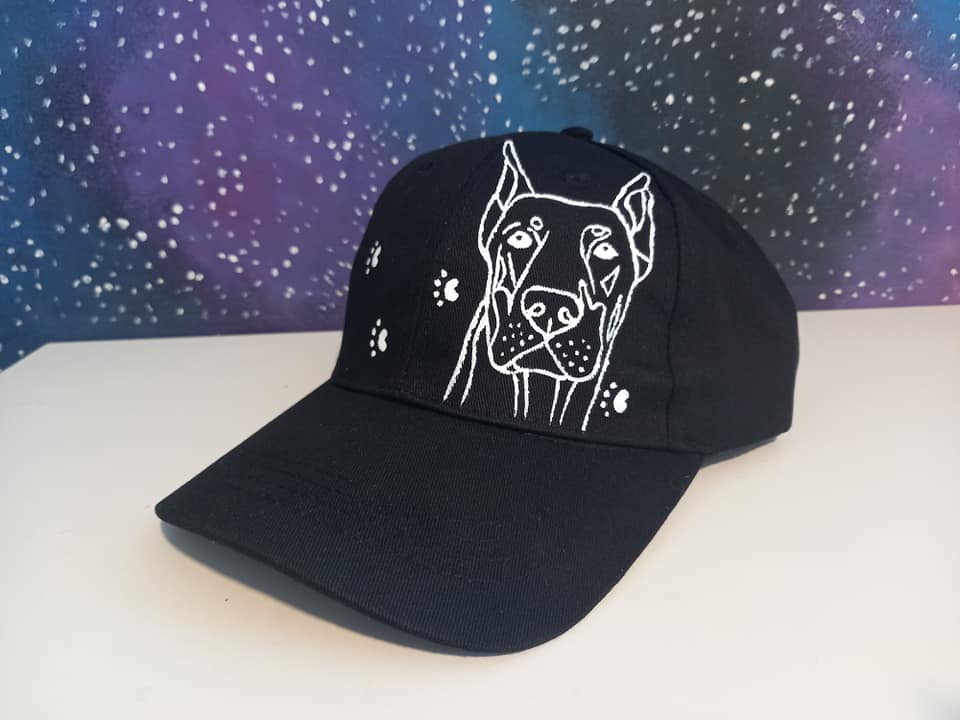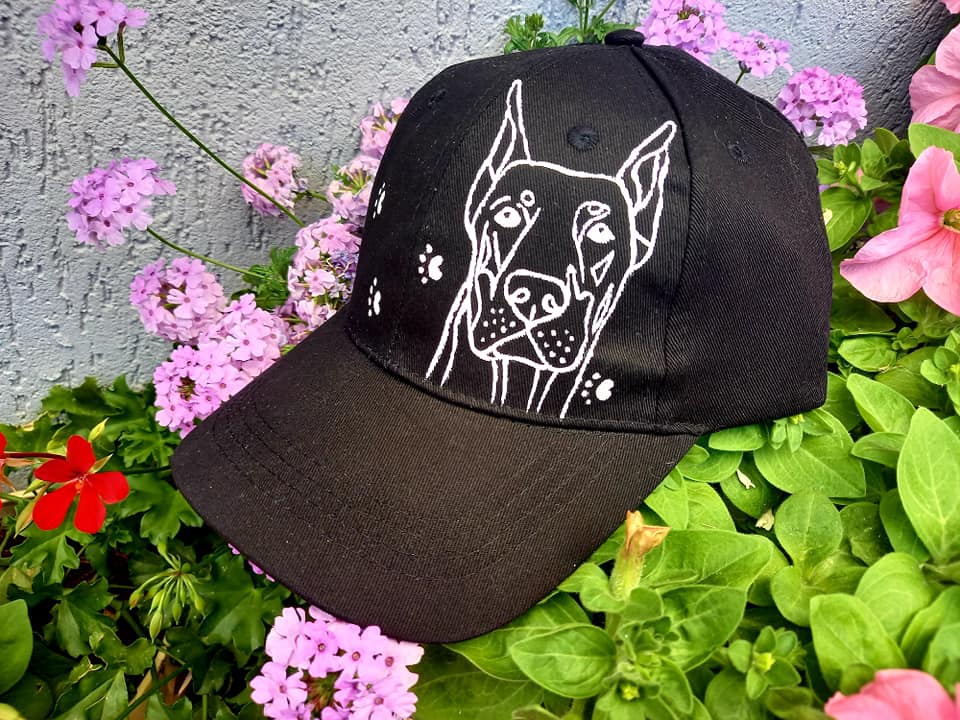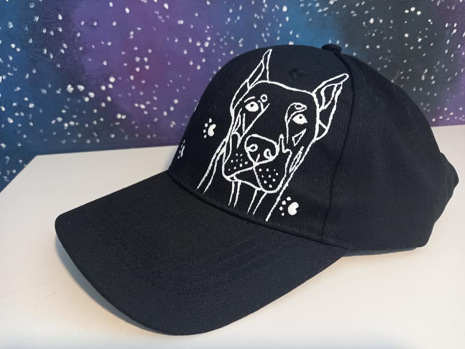 Wyjątkowa ręcznie malowana czapka z daszkiem z Dobermanem.