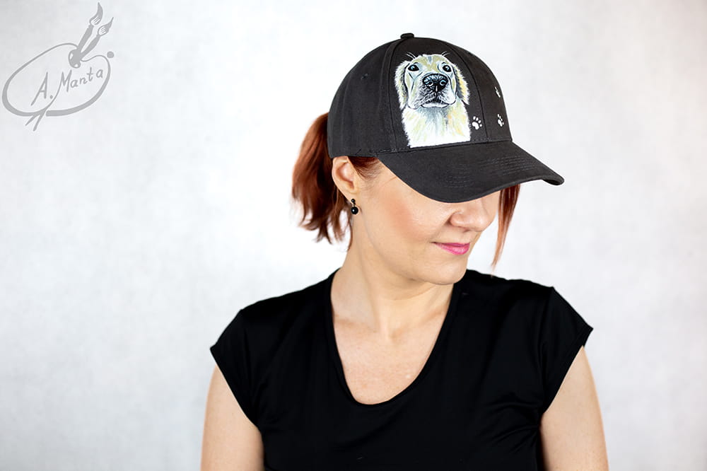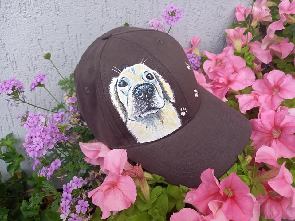 Wyjątkowa ręcznie malowana czapka z daszkiem z Golden Retriever.