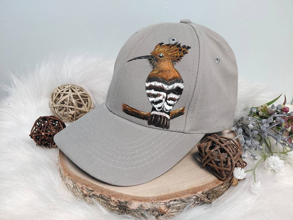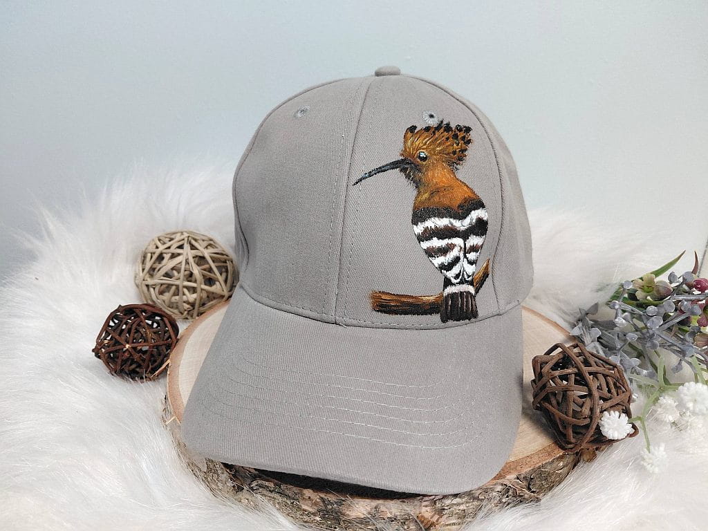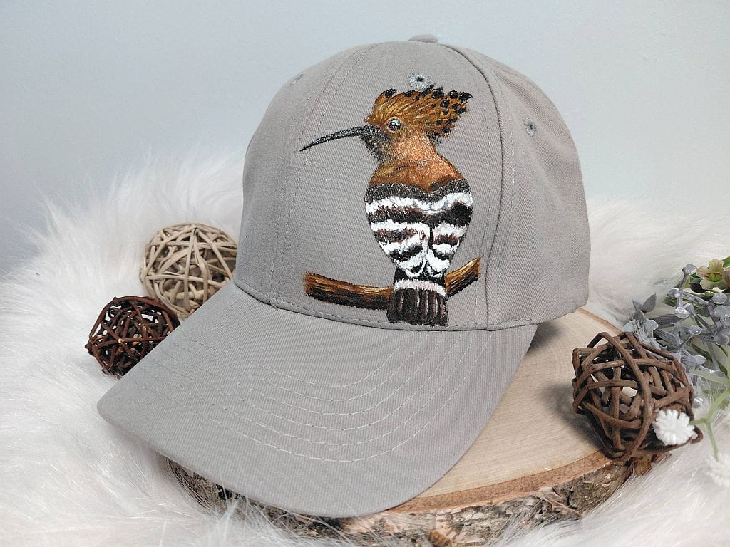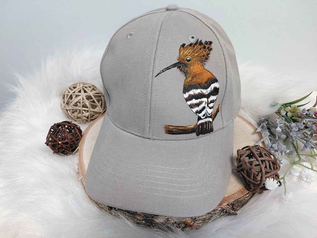 Wyjątkowa ręcznie malowana czapka z daszkiem ptak dudek