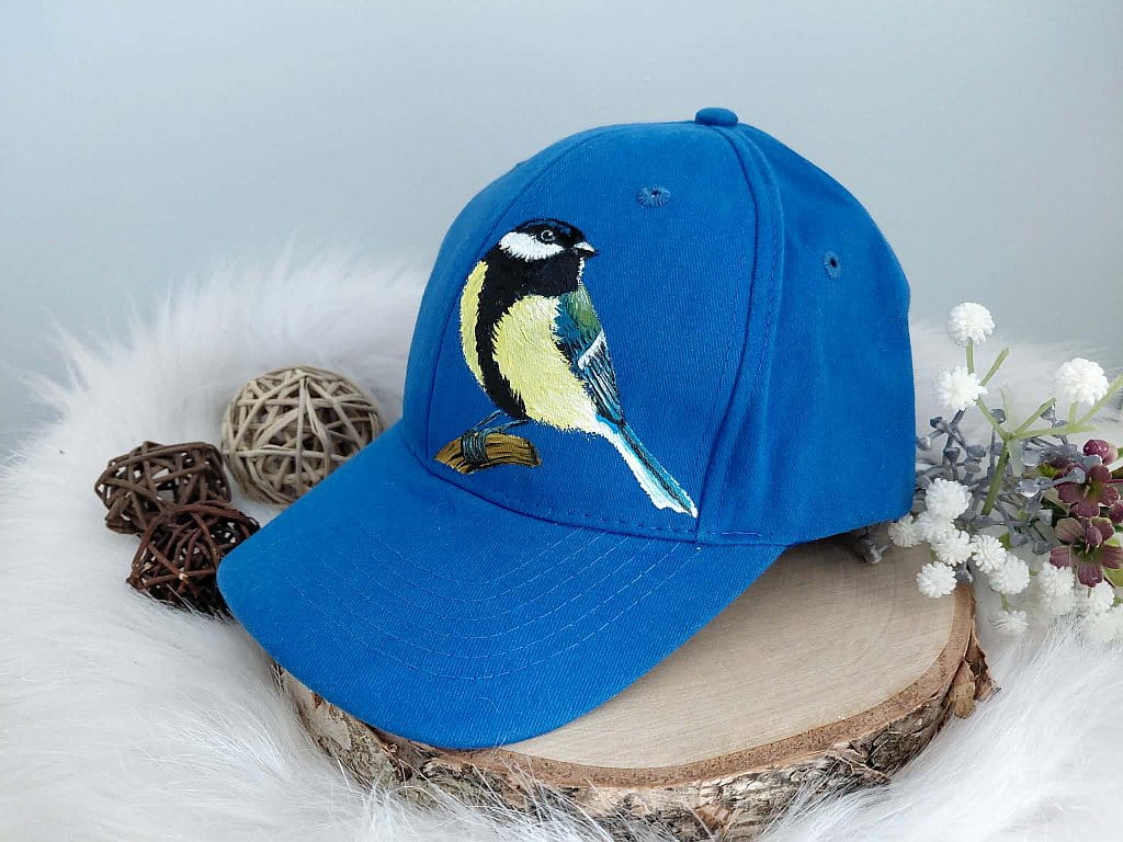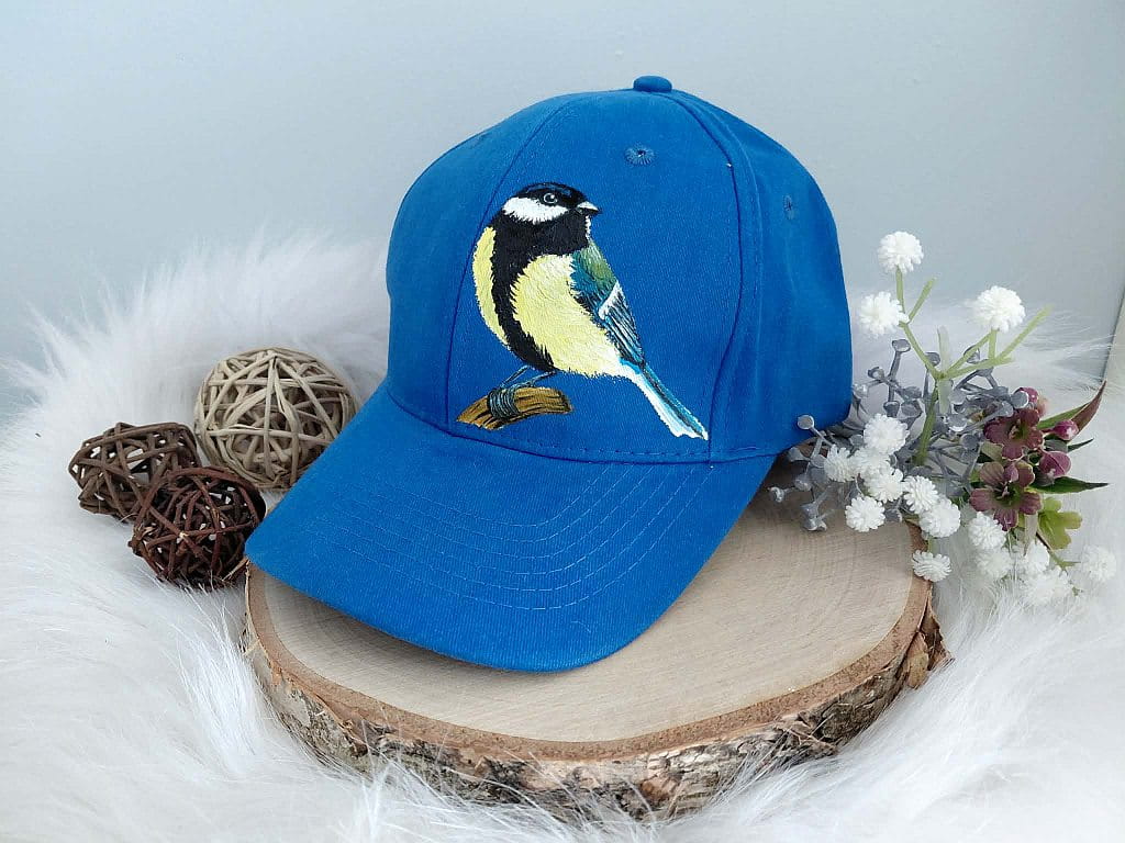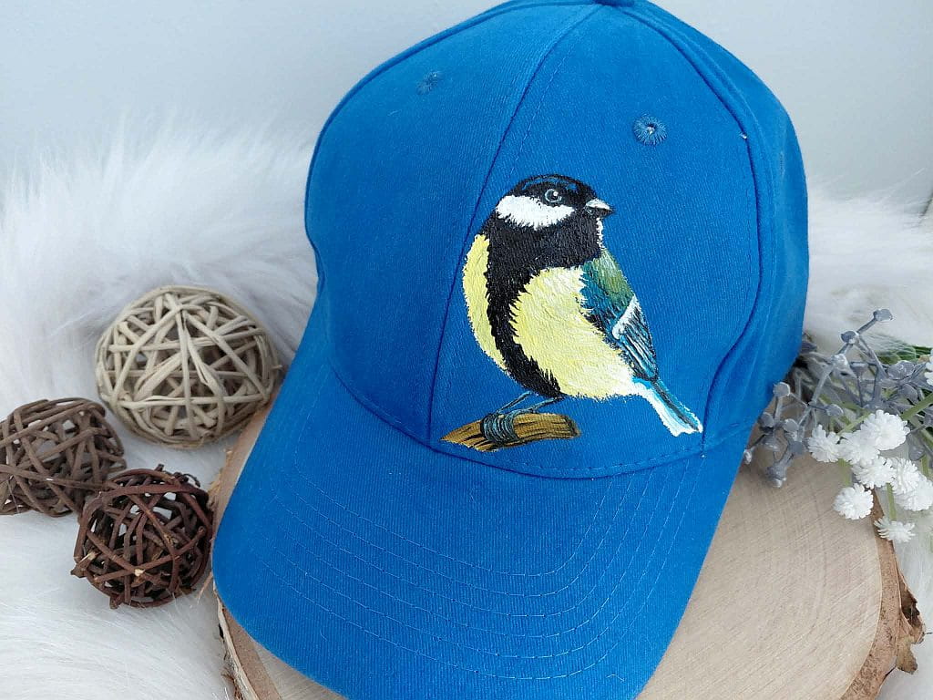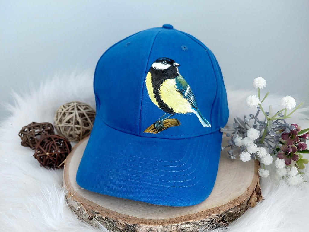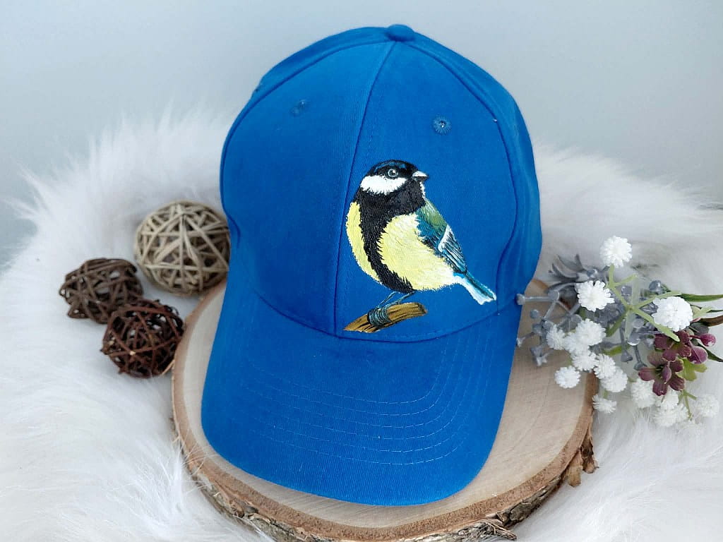 Wyjątkowa ręcznie malowana czapka z daszkiem ptak sikora bogatka