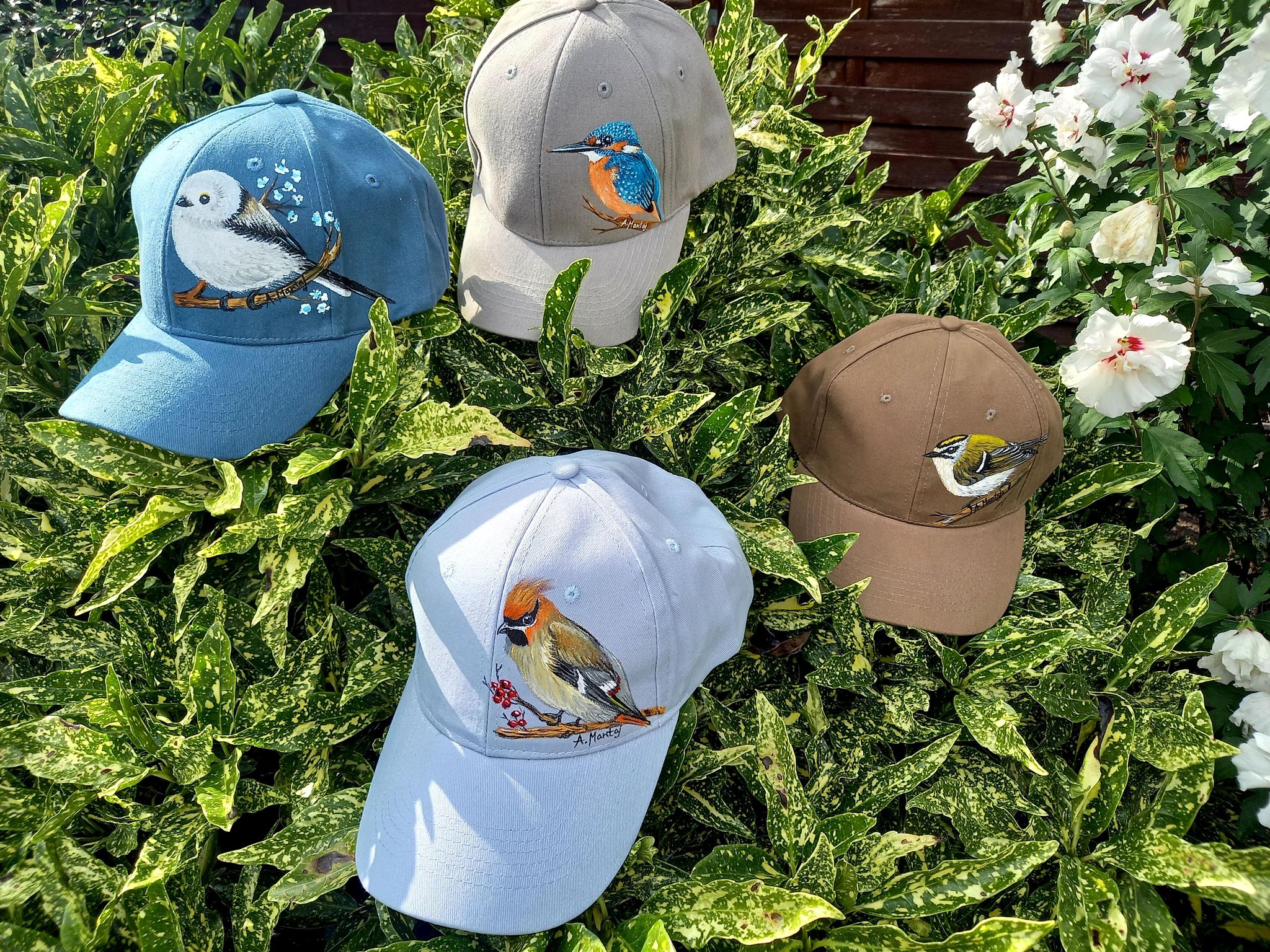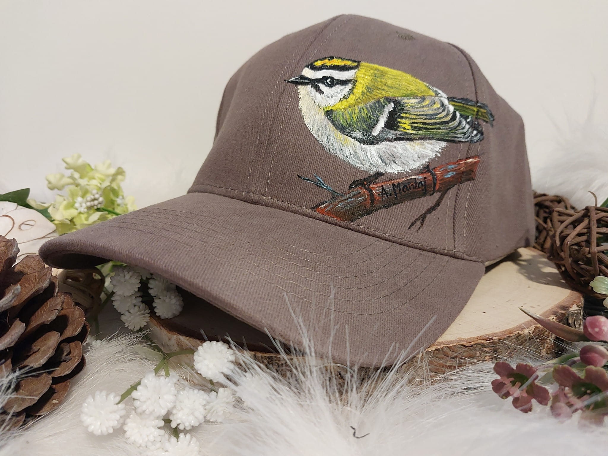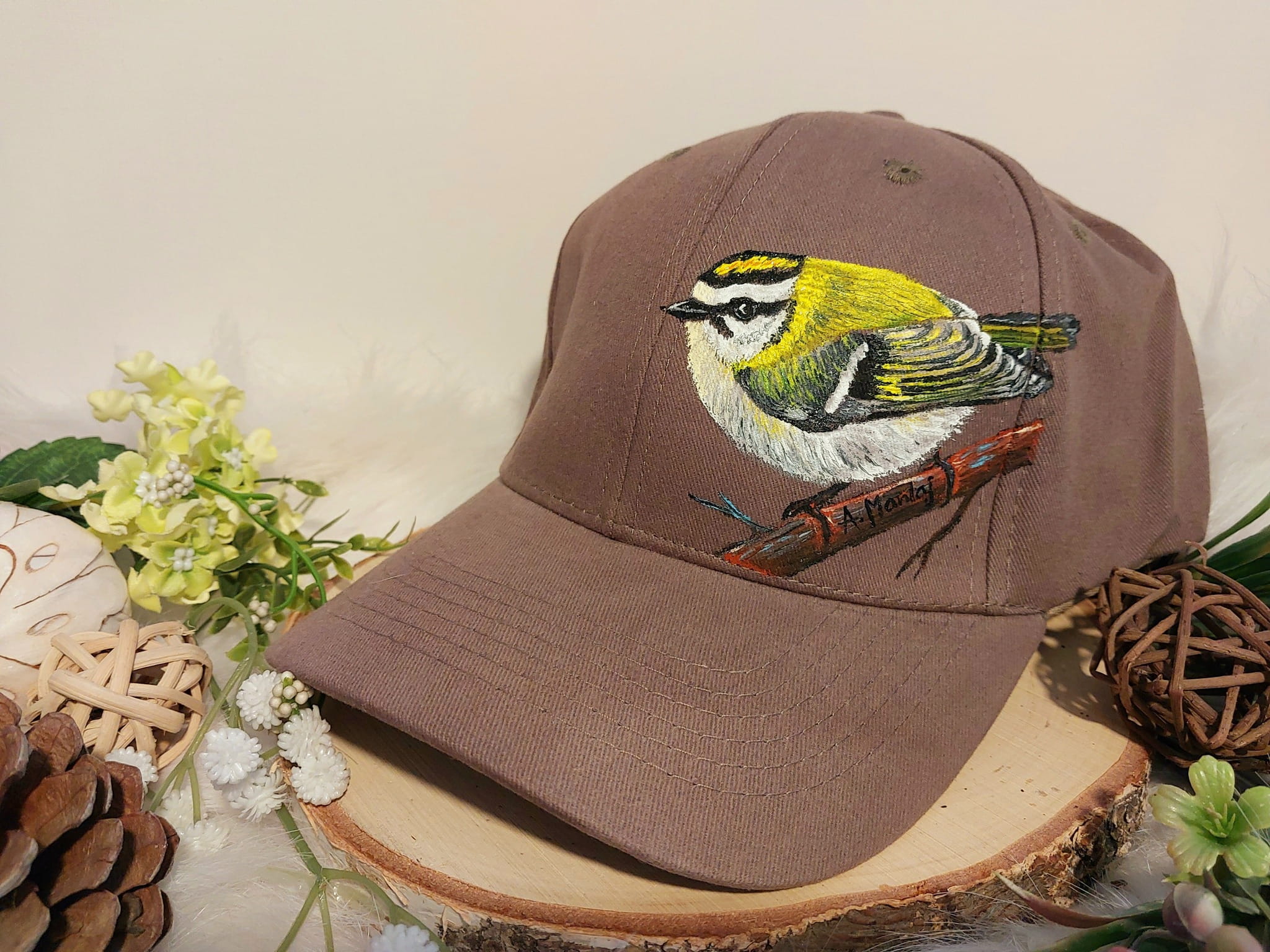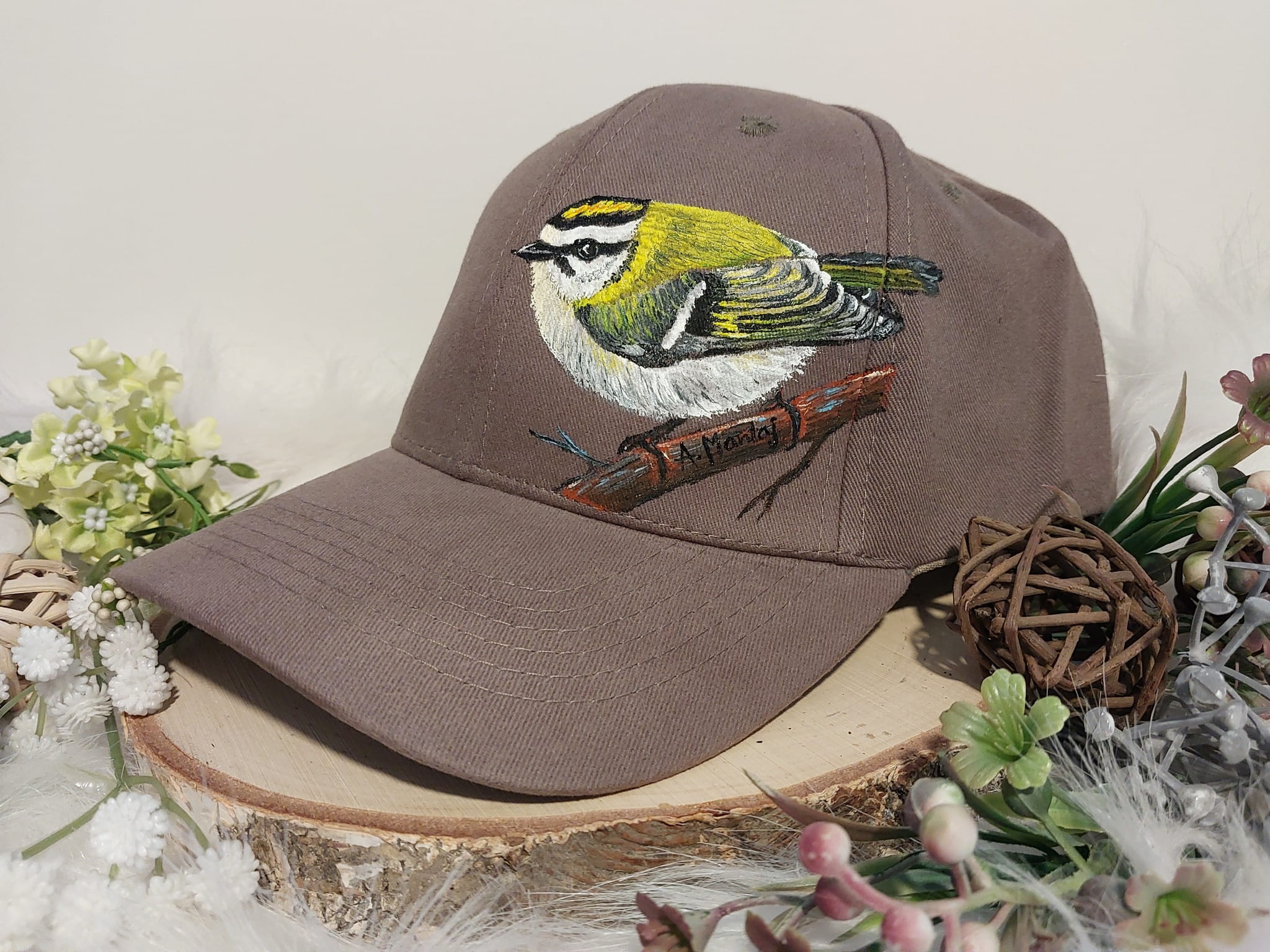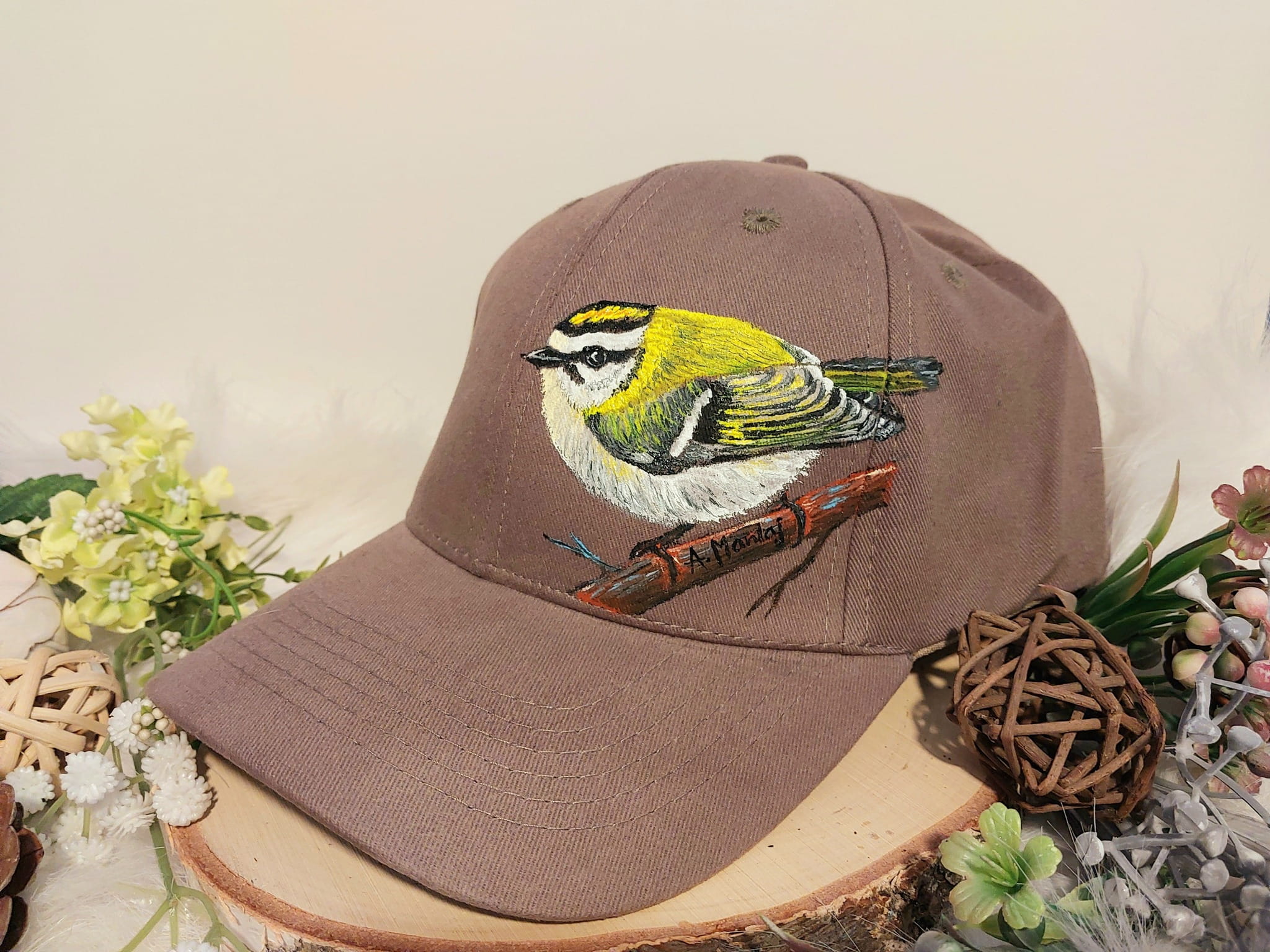 Wyjątkowa ręcznie malowana czapka z daszkiem ptak zniczek