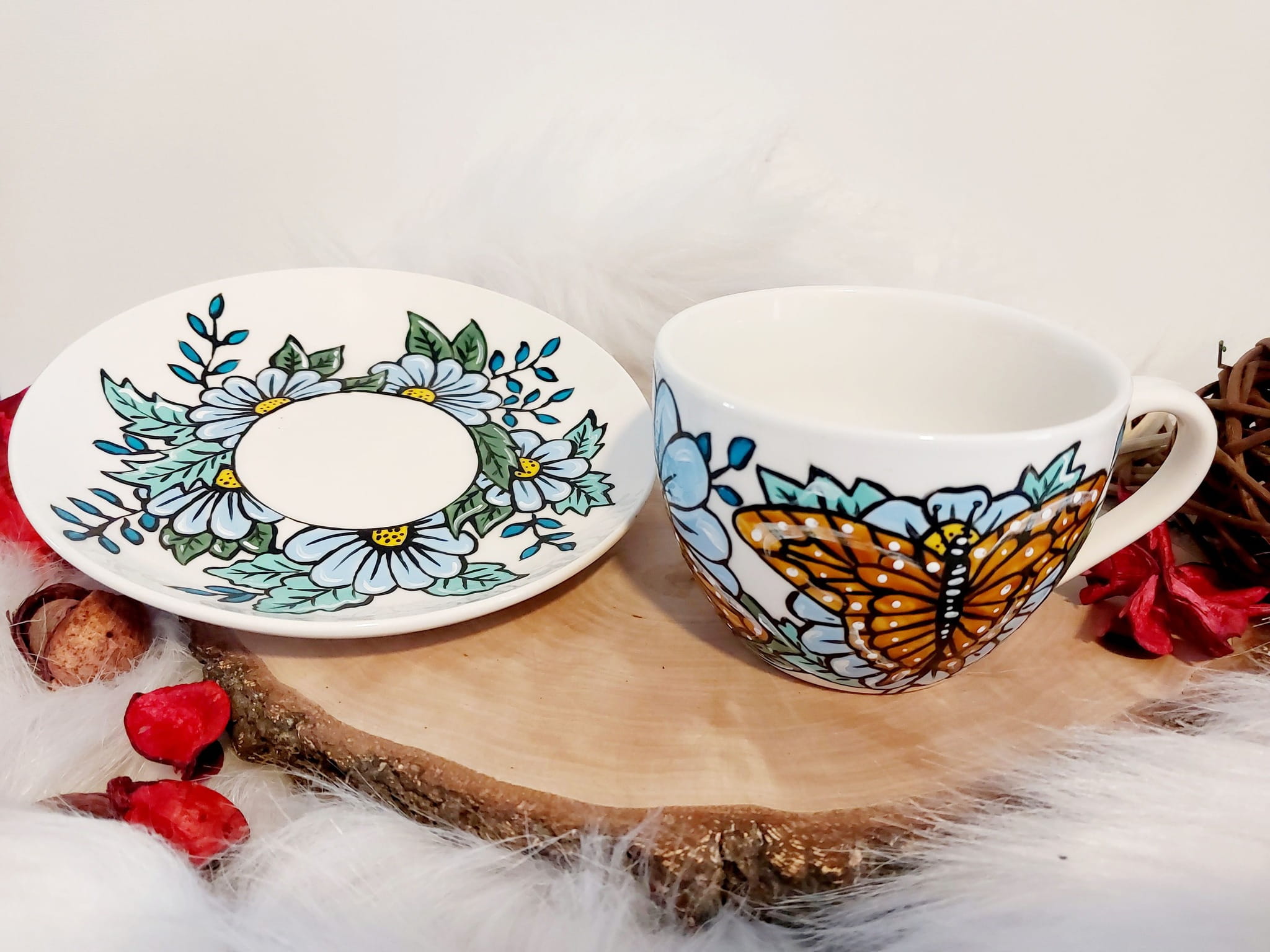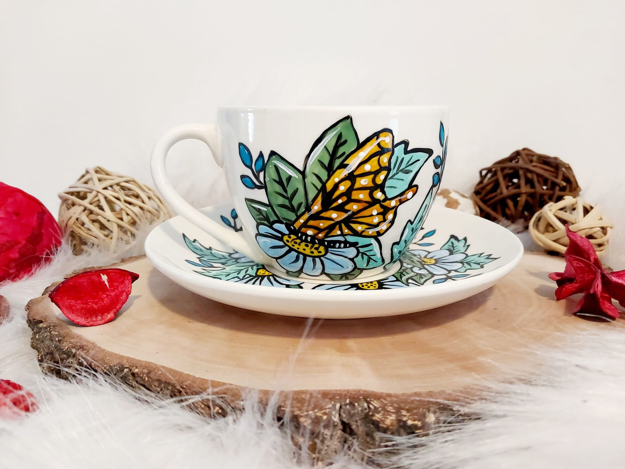 Filiżanka ręcznie malowana motyl i kwiaty