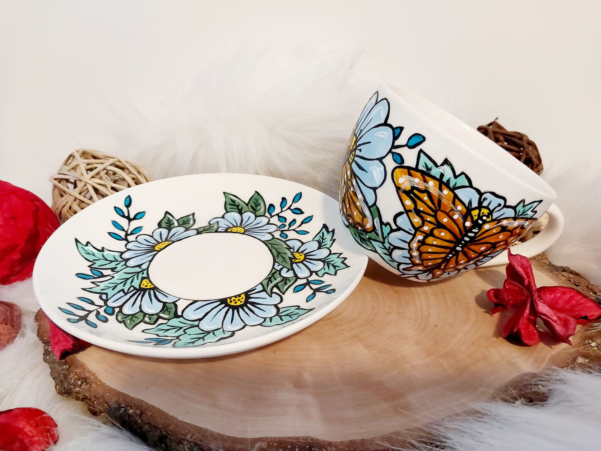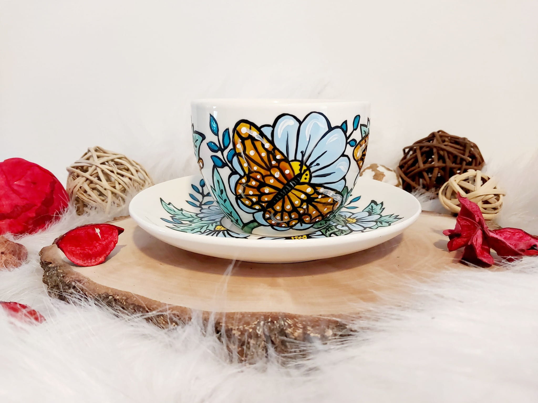 Wyjątkowa, ręcznie malowana filiżanka motyl i kwiaty