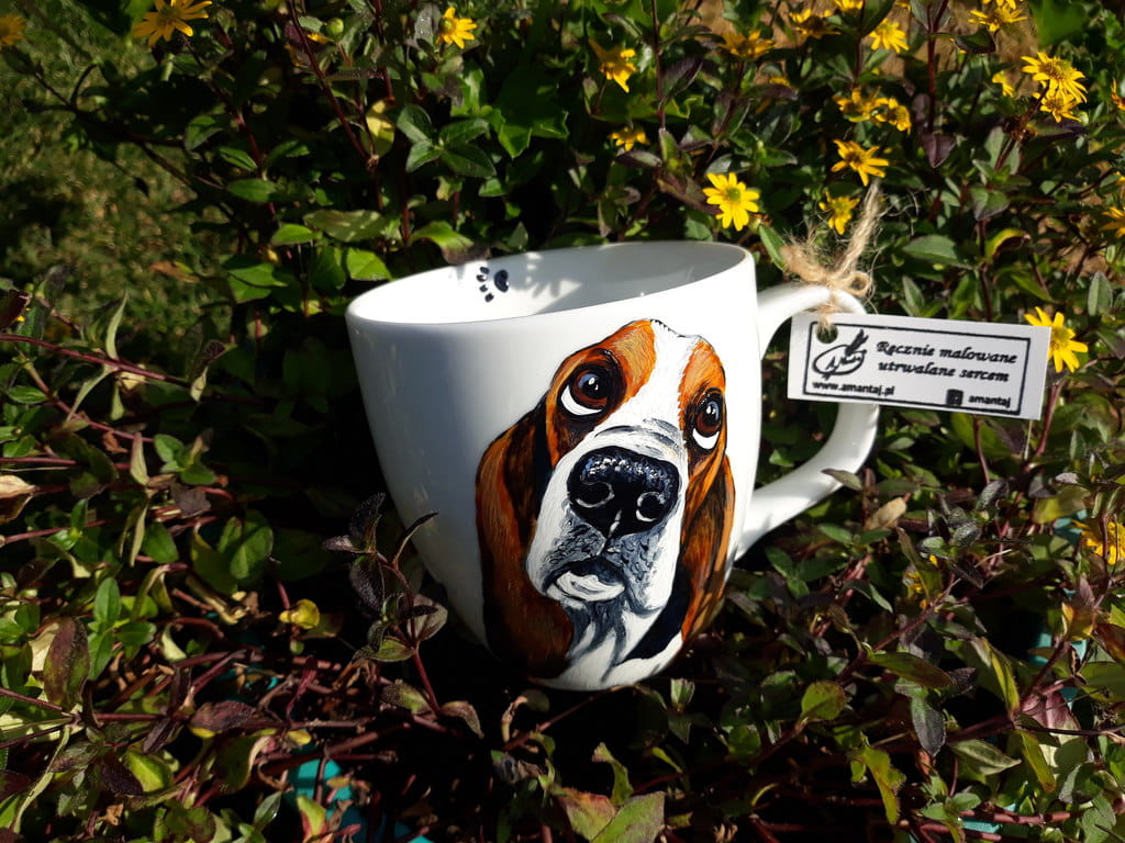 Wyjątkowy, ręcznie malowany kubek Basset.