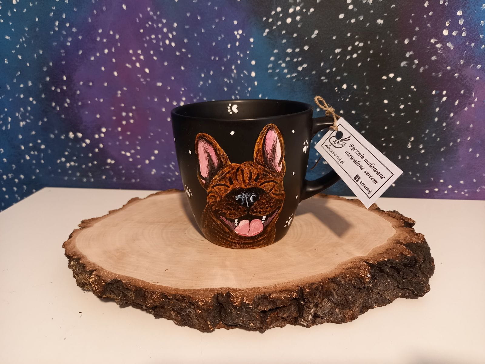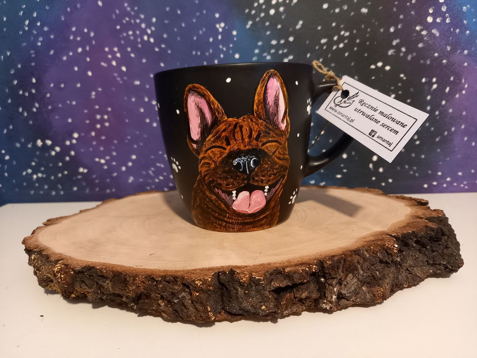 Wyjątkowy, ręcznie malowany kubek z autorskim motywem Buldoga francuskiego.