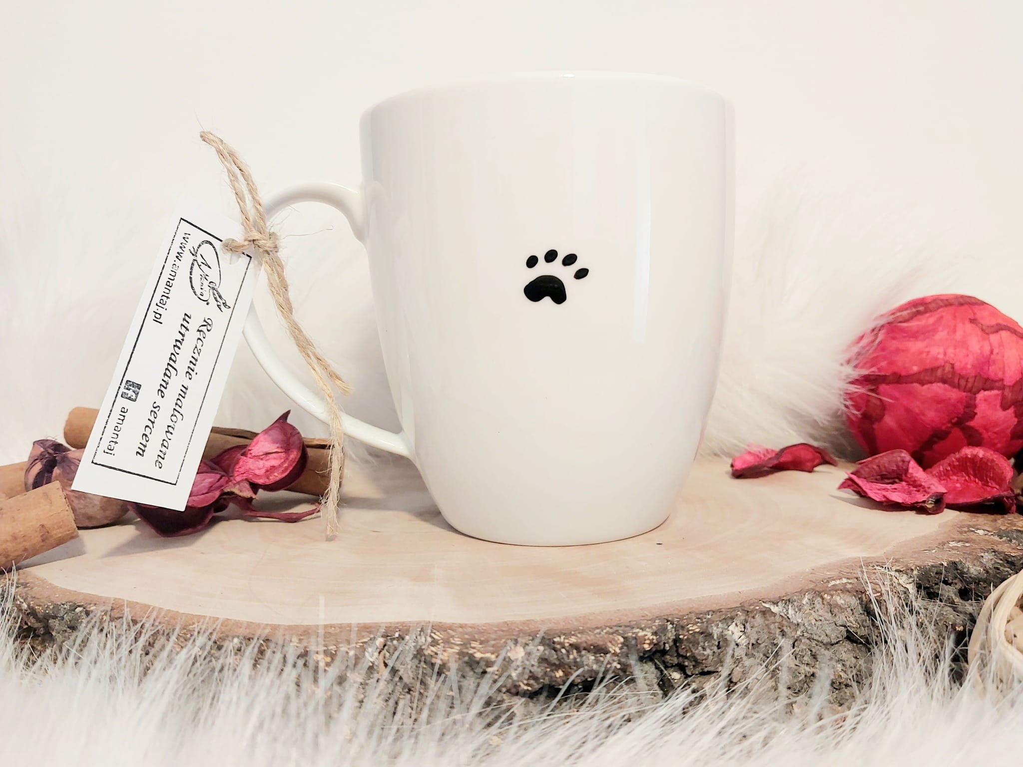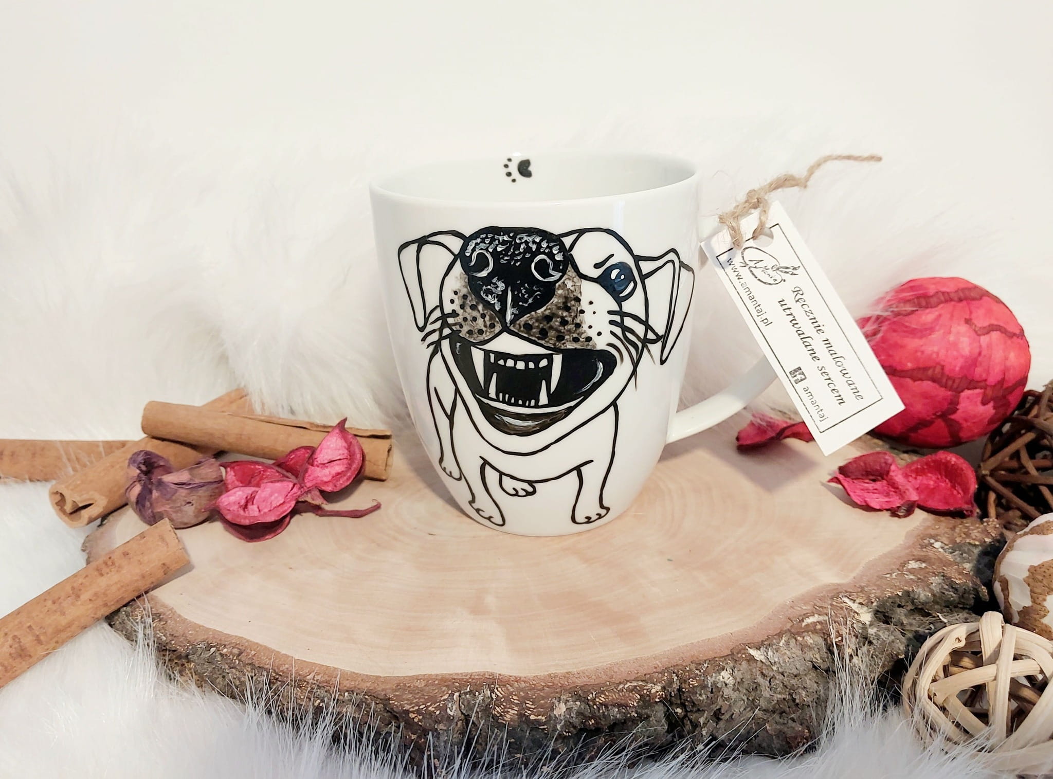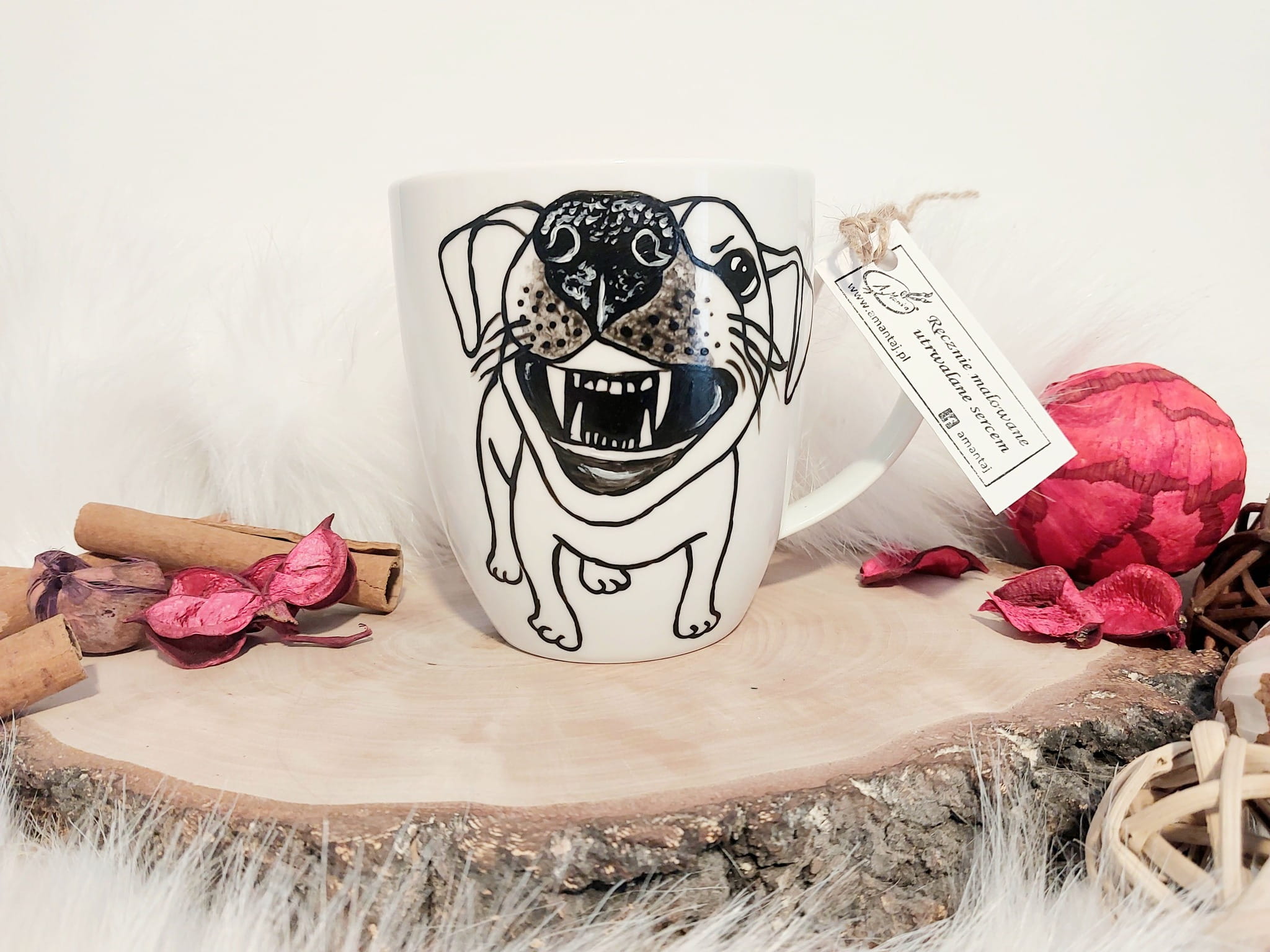 Kubek malowany specjalistycznymi farbami do ceramiki, absolutnie bezpiecznymi, wypalany w 160 stopniach, przez co malunek jest bardzo trwały. By cieszyć się nim dłuuugie lata, zaleca się mycie ręczne :)