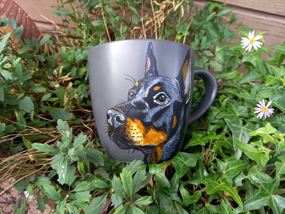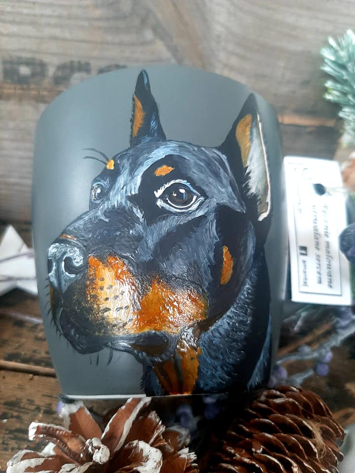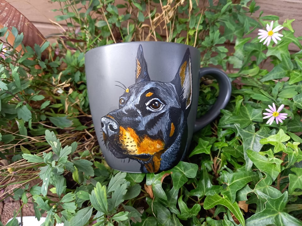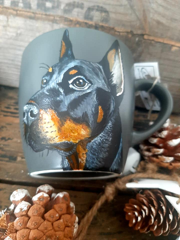 Wyjątkowy, ręcznie malowany kubek z autorskim motywem Dobermana.