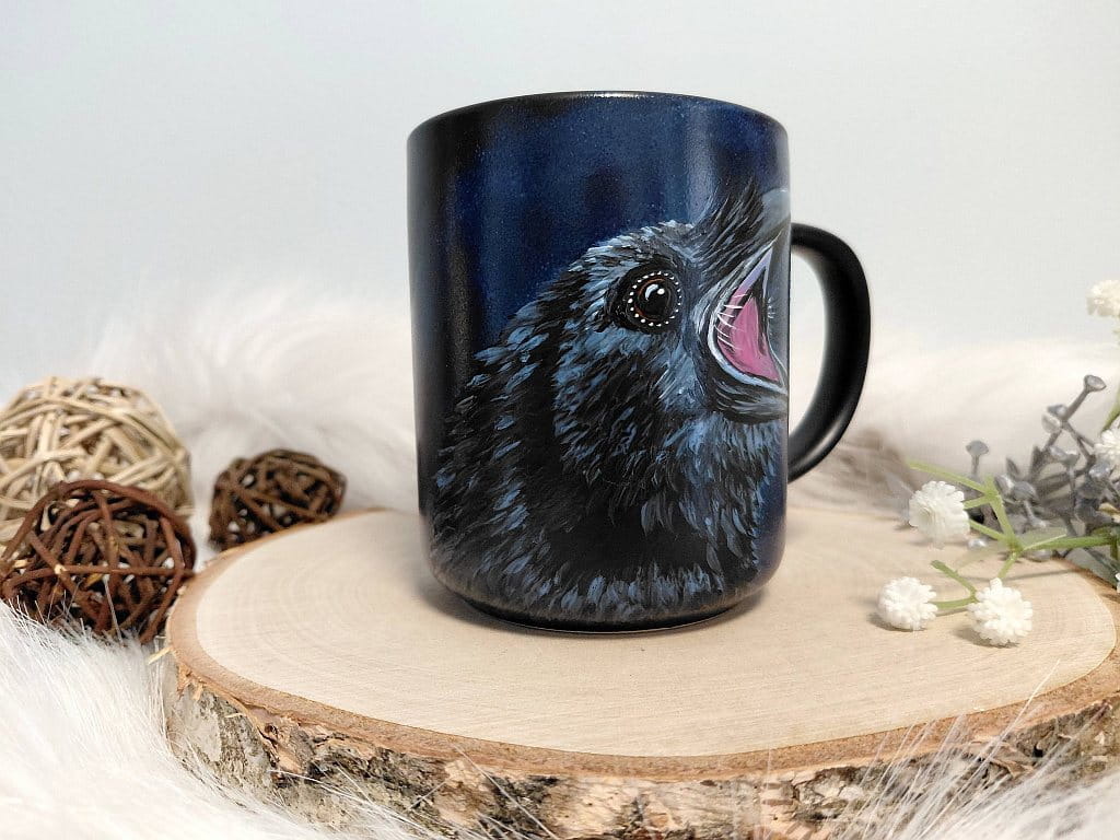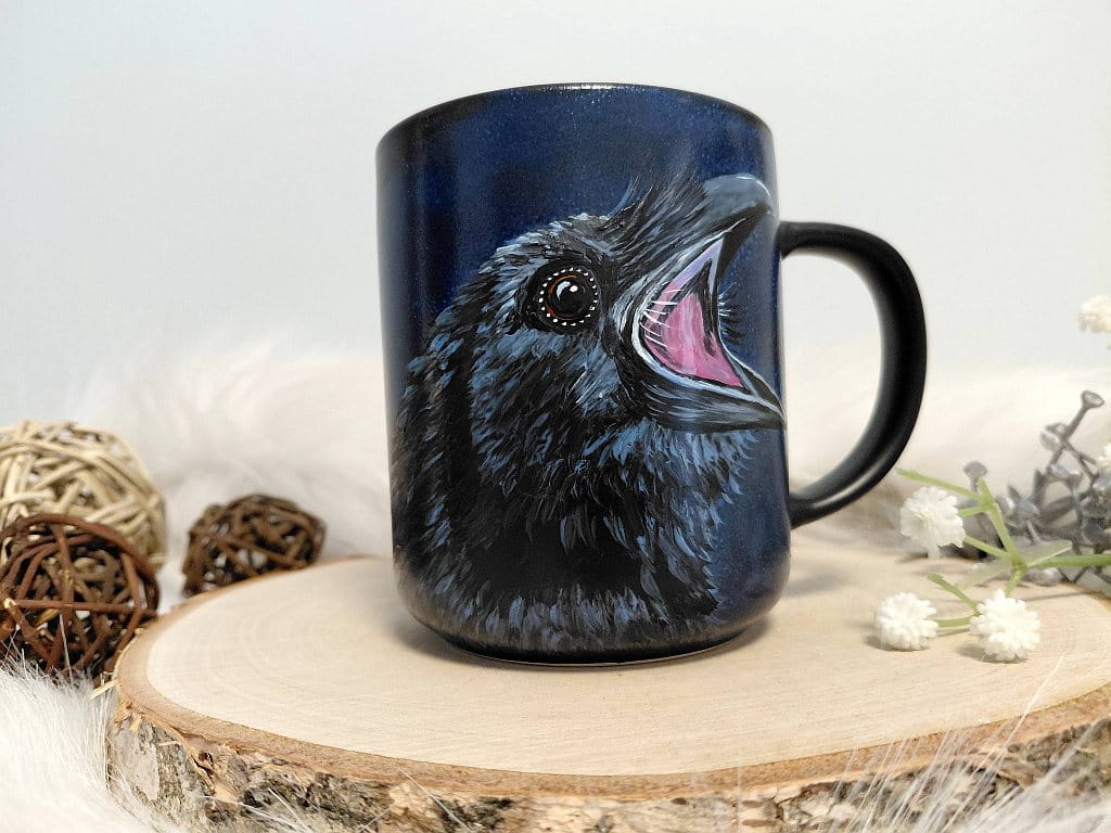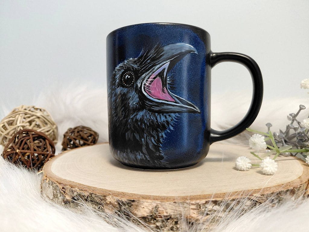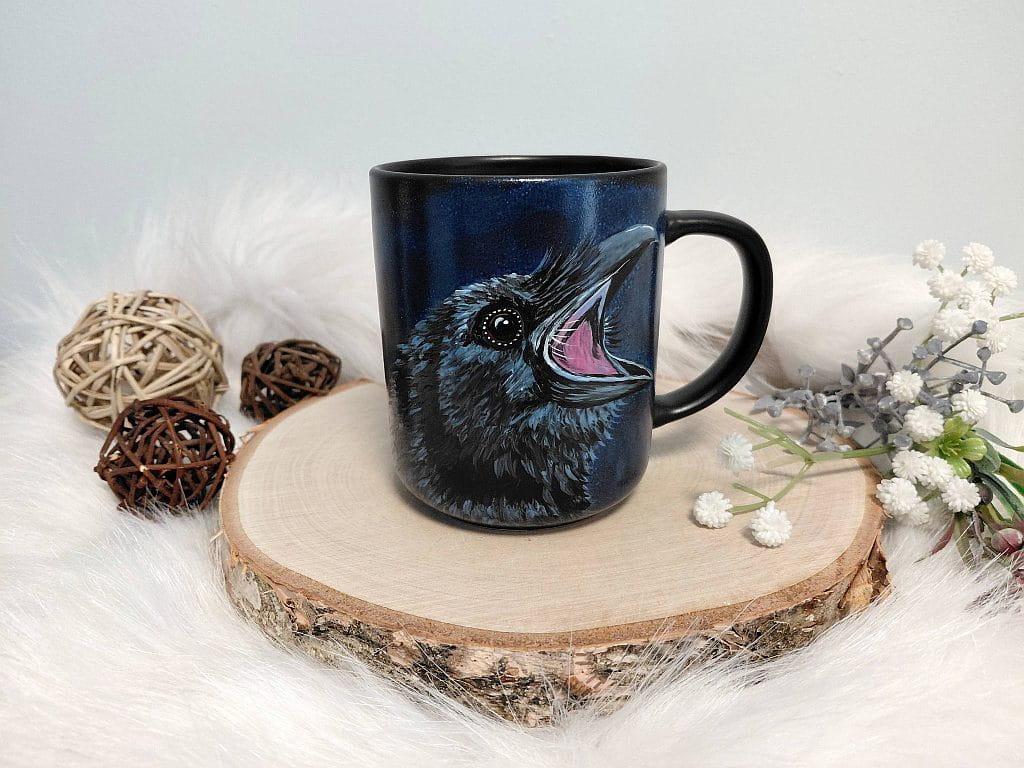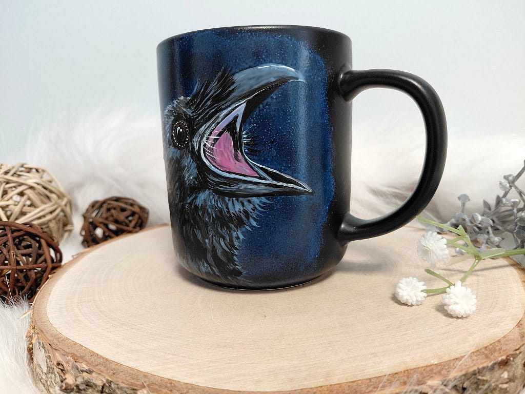 Wyjątkowy, ręcznie malowany kubek ptak Kruk.