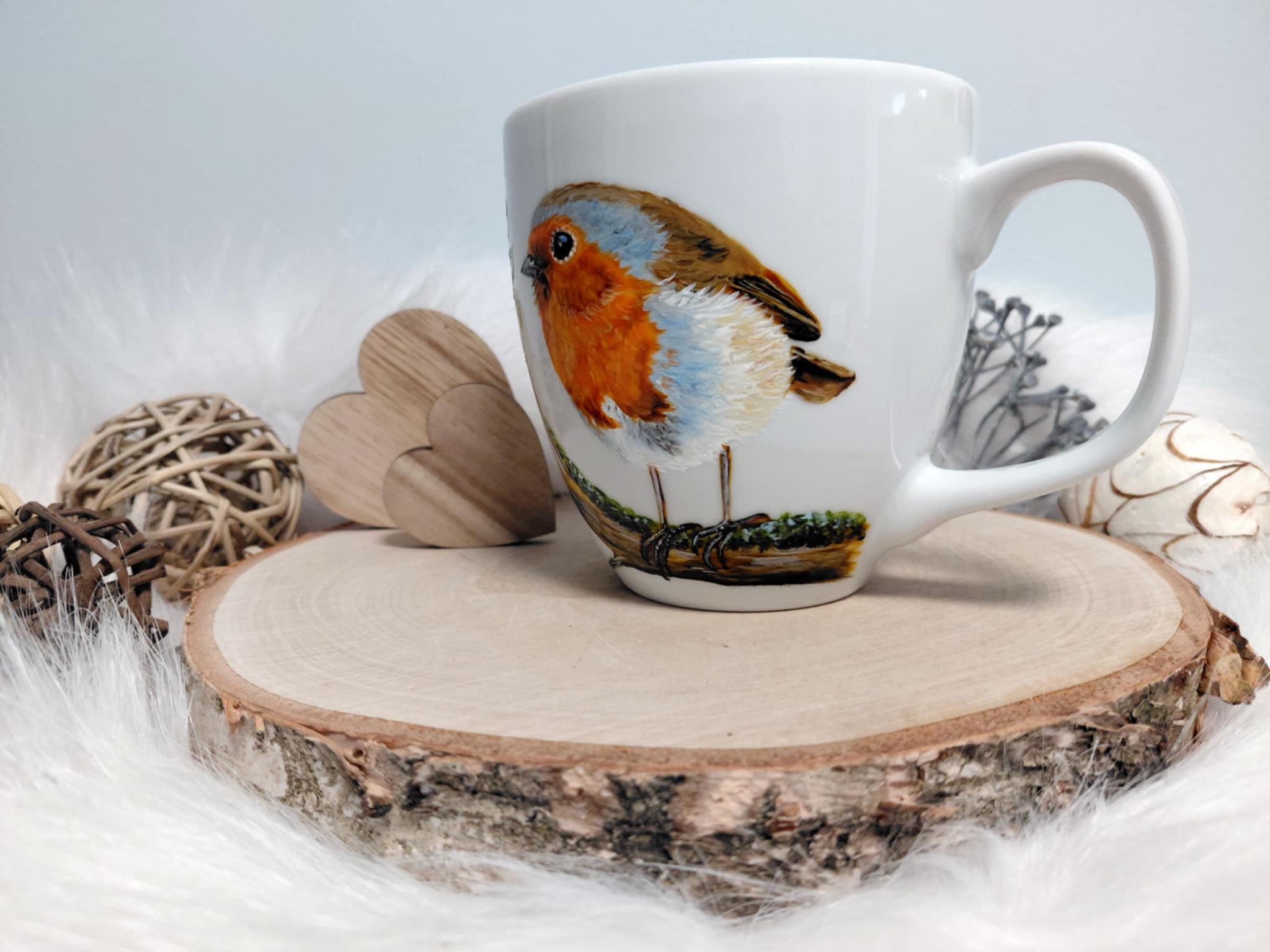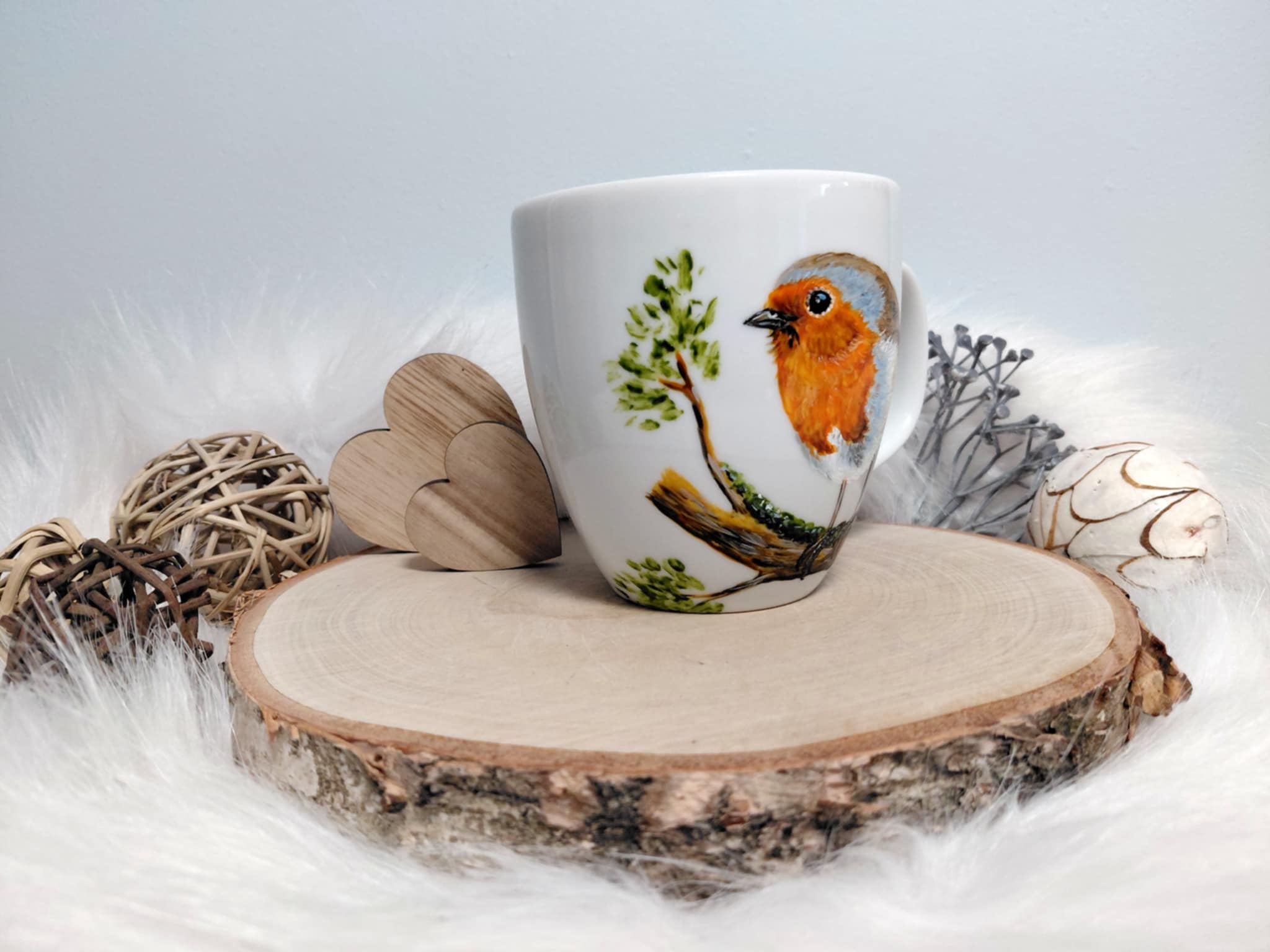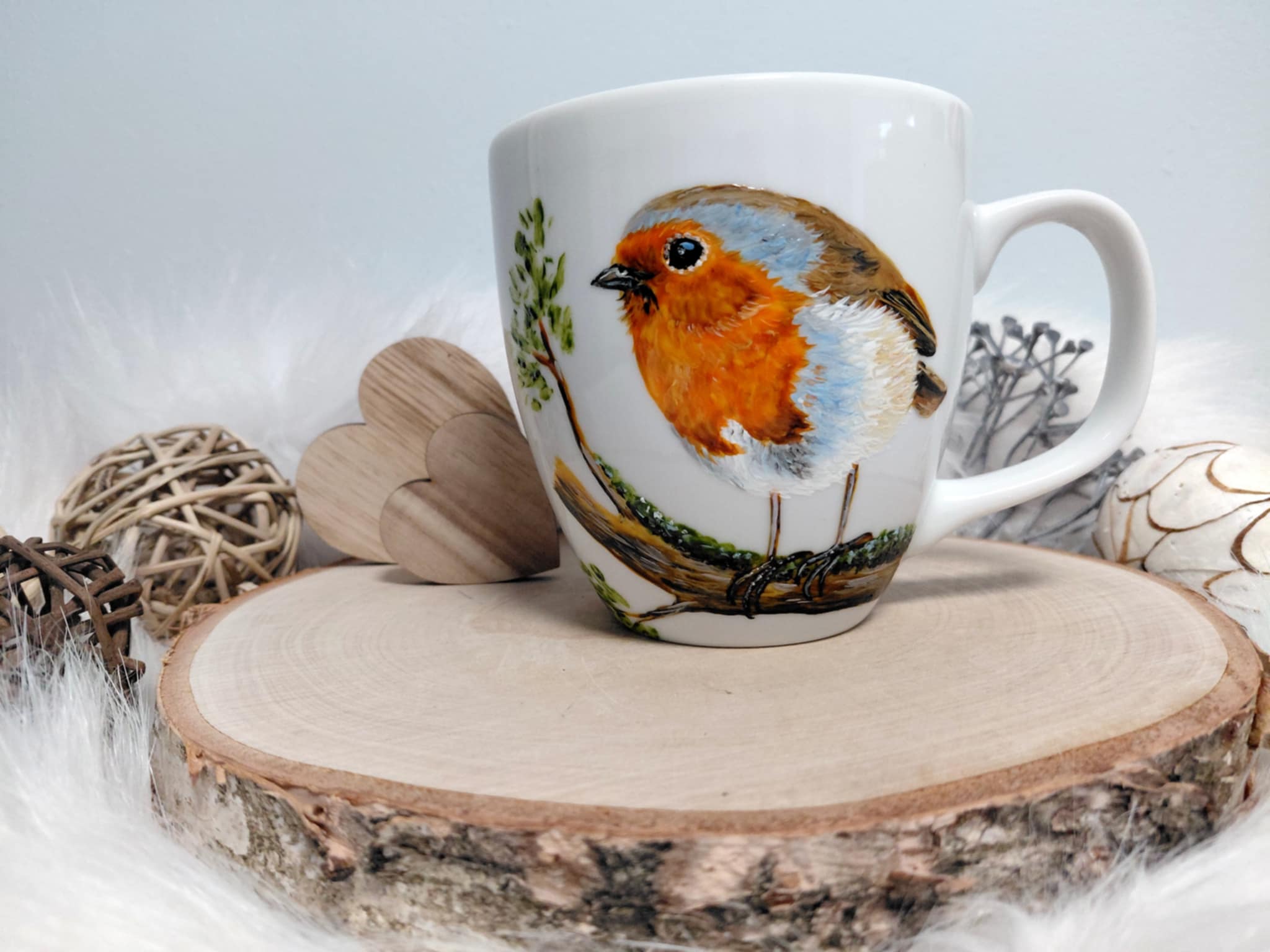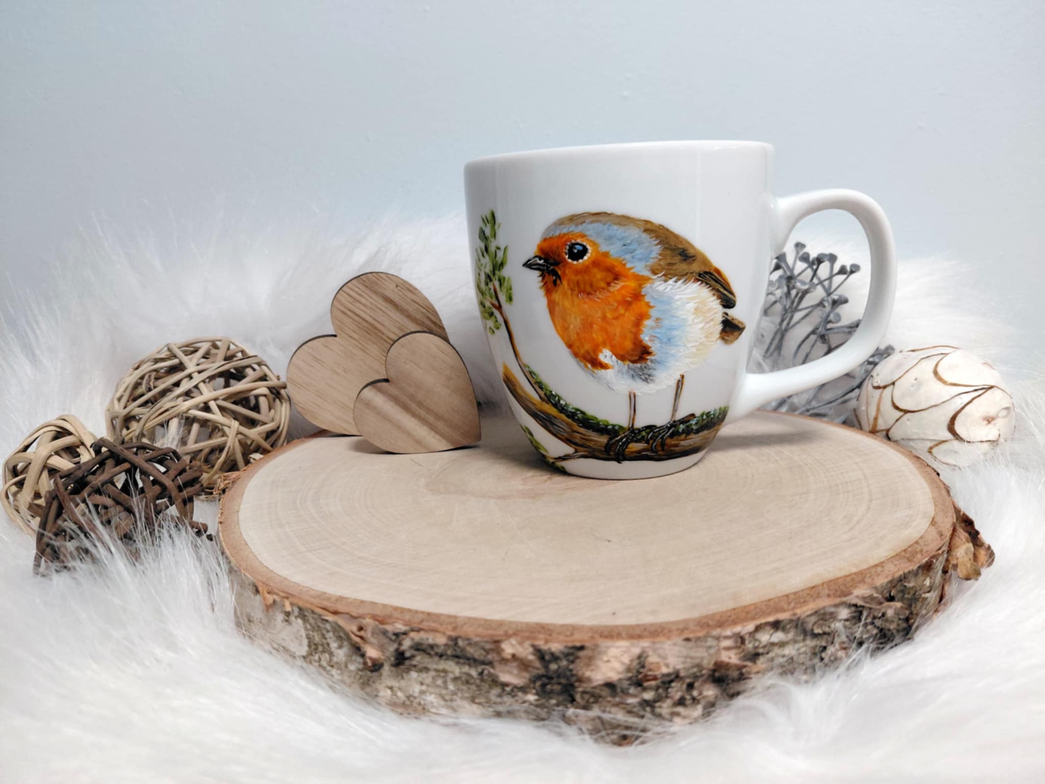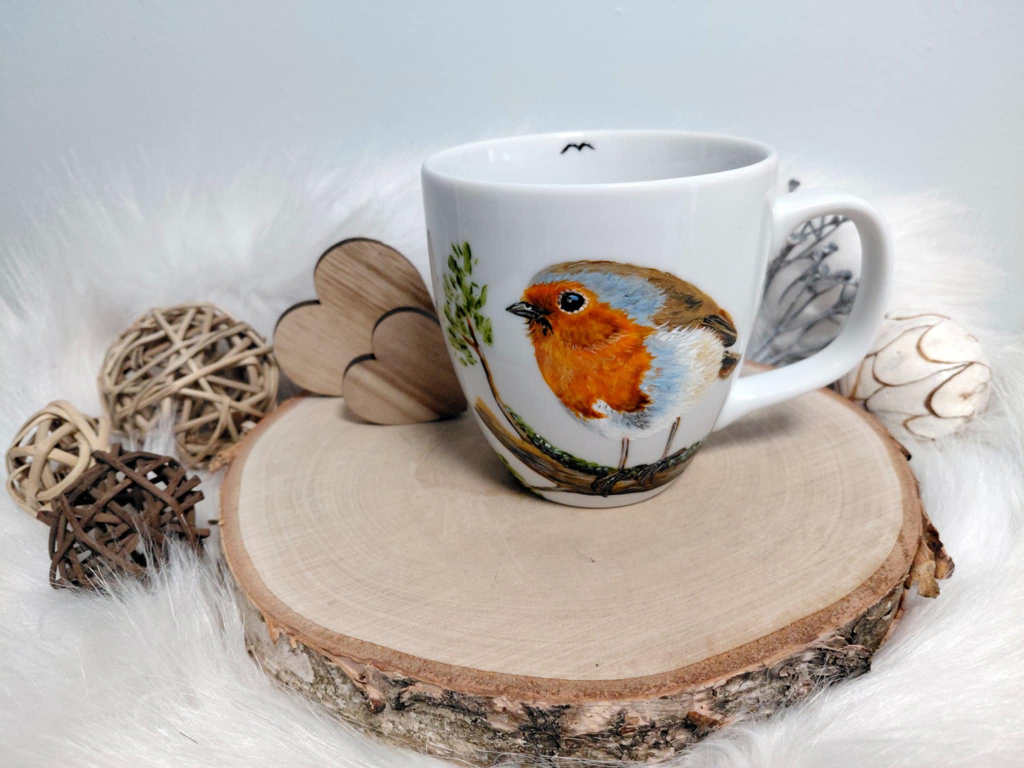 Wyjątkowy, ręcznie malowany kubek Ptak Rudzik.