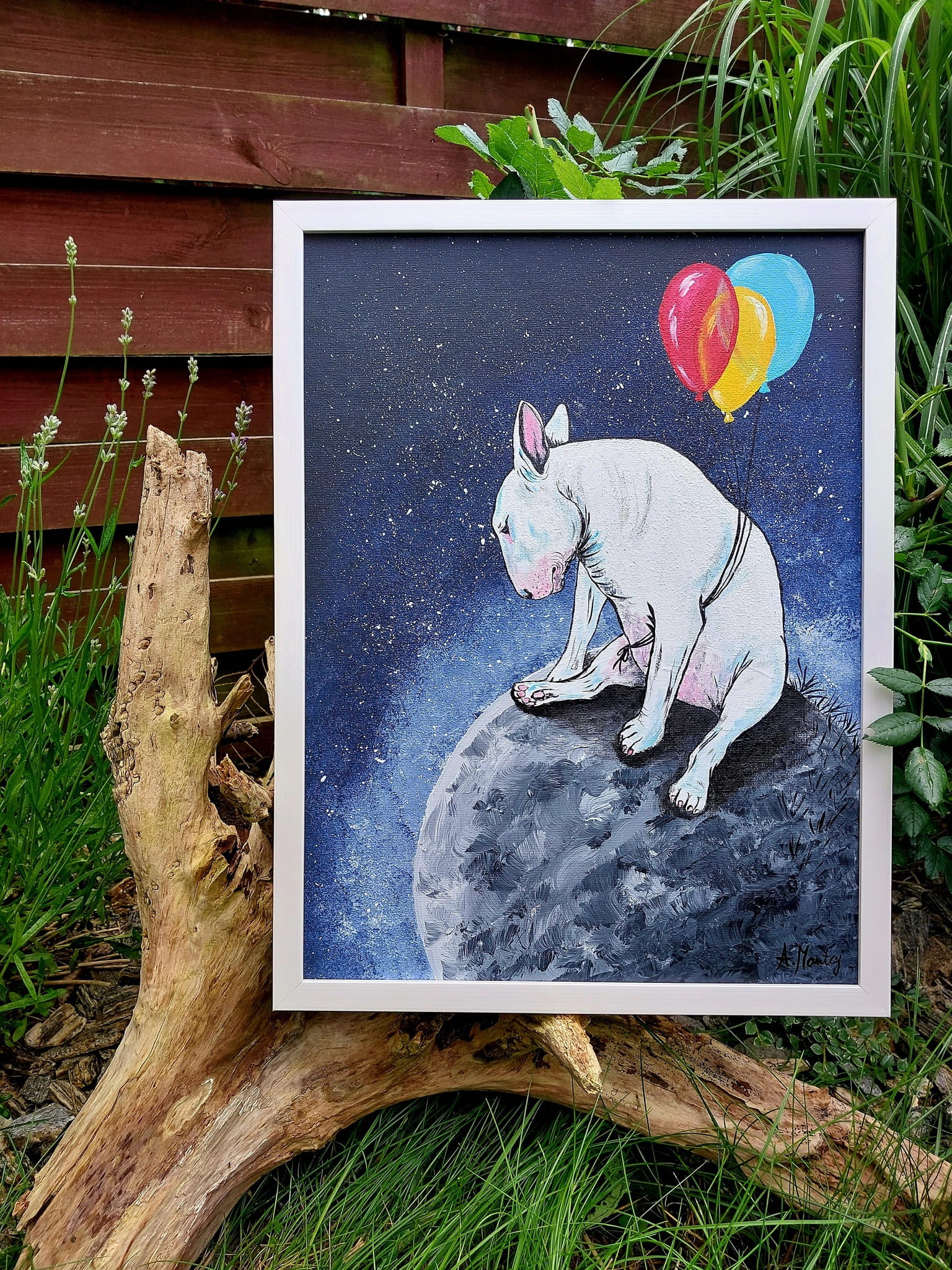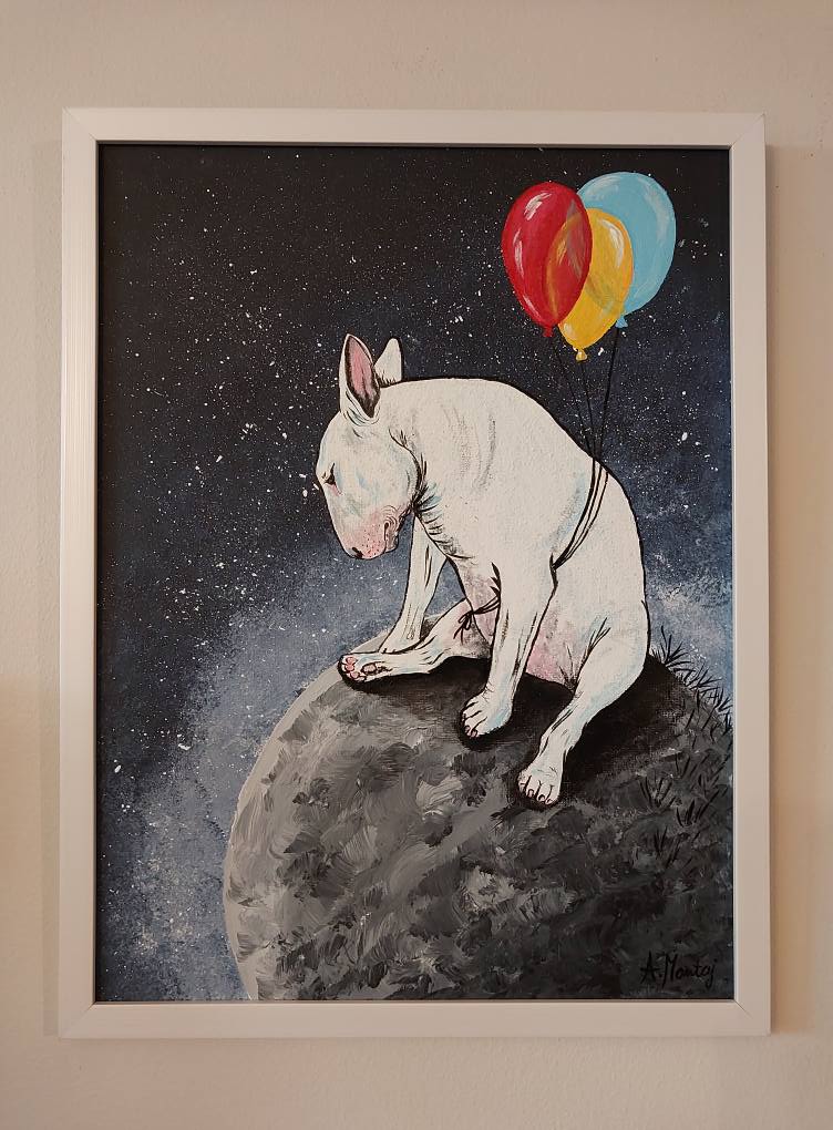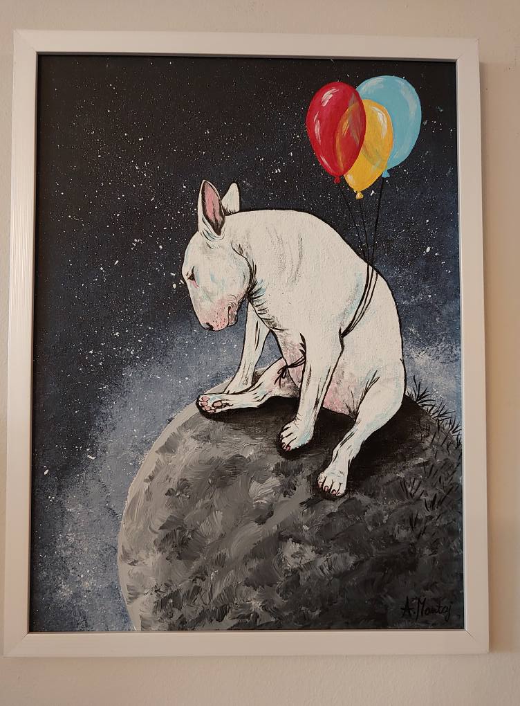 Ręcznie malowany obraz "Bul istnienia" - namalowany na płycie malarskiej o wymiarach 30x40 lub 40x50 cm albo na płótnie naciągniętym na blejtram o wymiarach 50x70 cm (zamalowane boki - gotowy do powieszenia). Obraz oprawiony w delikatną białą, brązową lub czarną ramę.