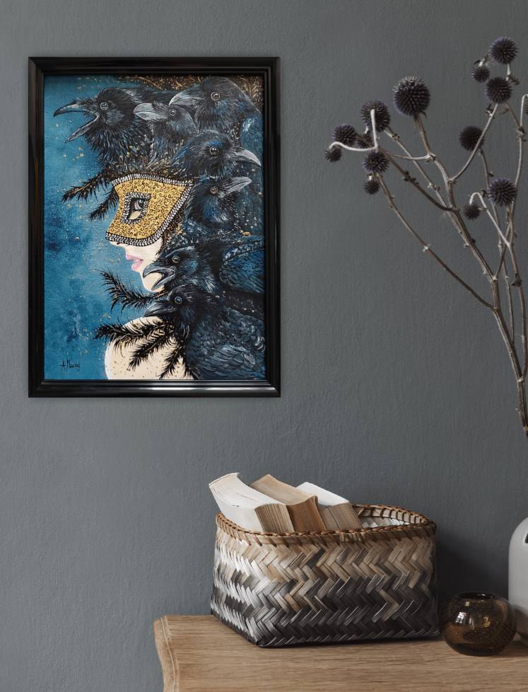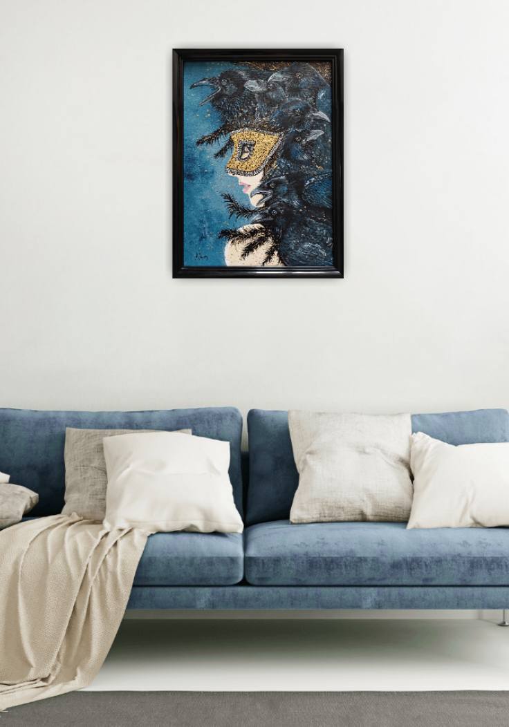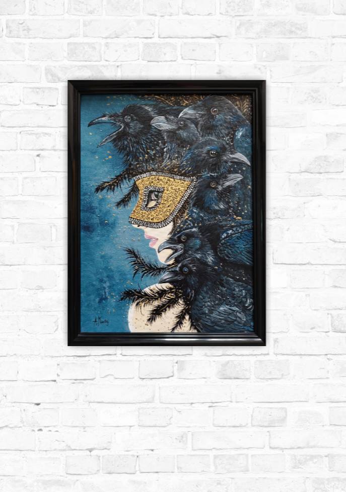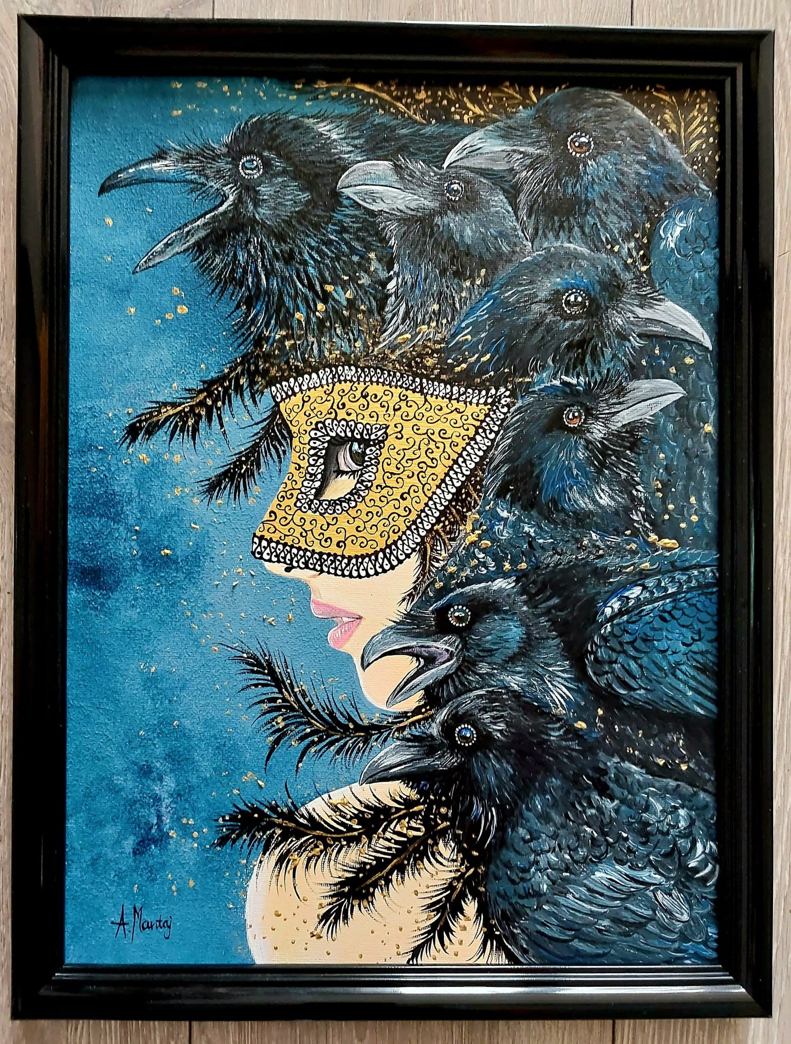 Jedyny taki, ręcznie malowany obraz Tańcząca z krukami - namalowany na płótnie o wymiarach 30x40 cm. Obraz zabezpieczony werniksem, oprawiony w czarną ramę.