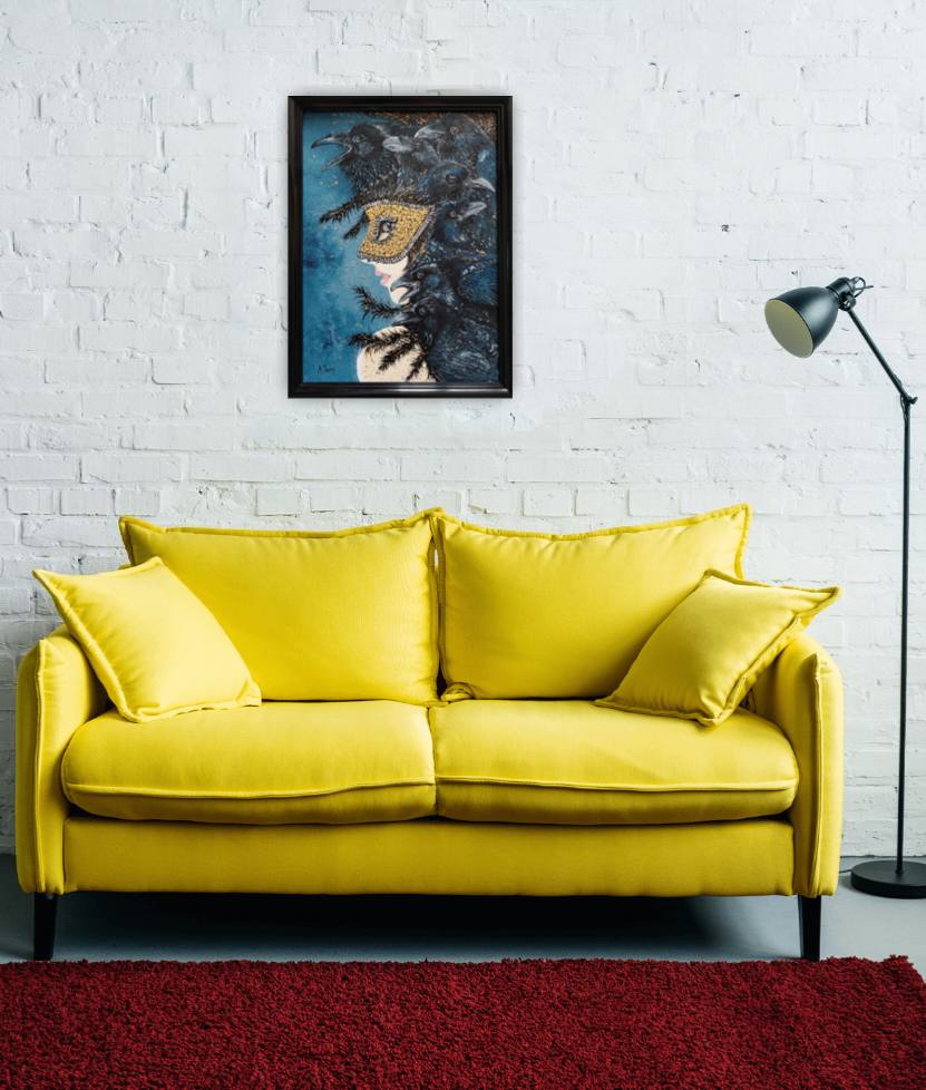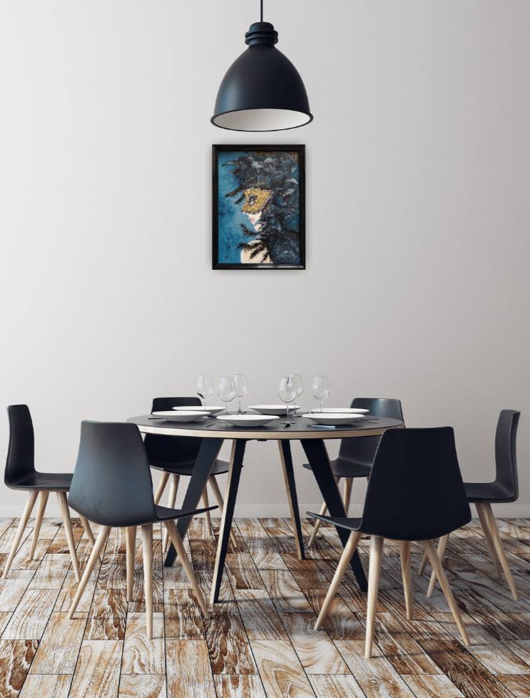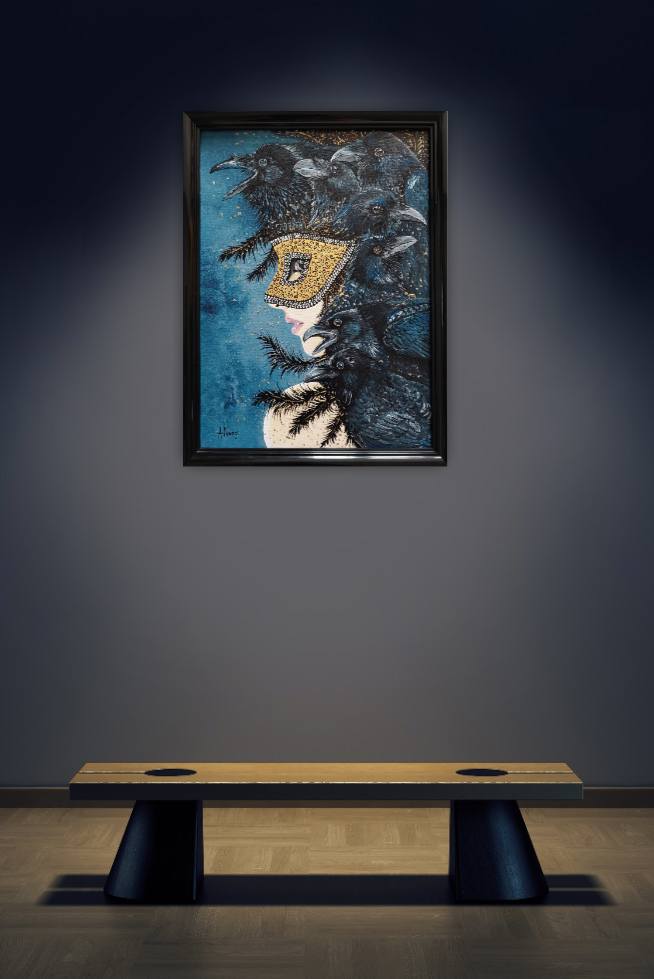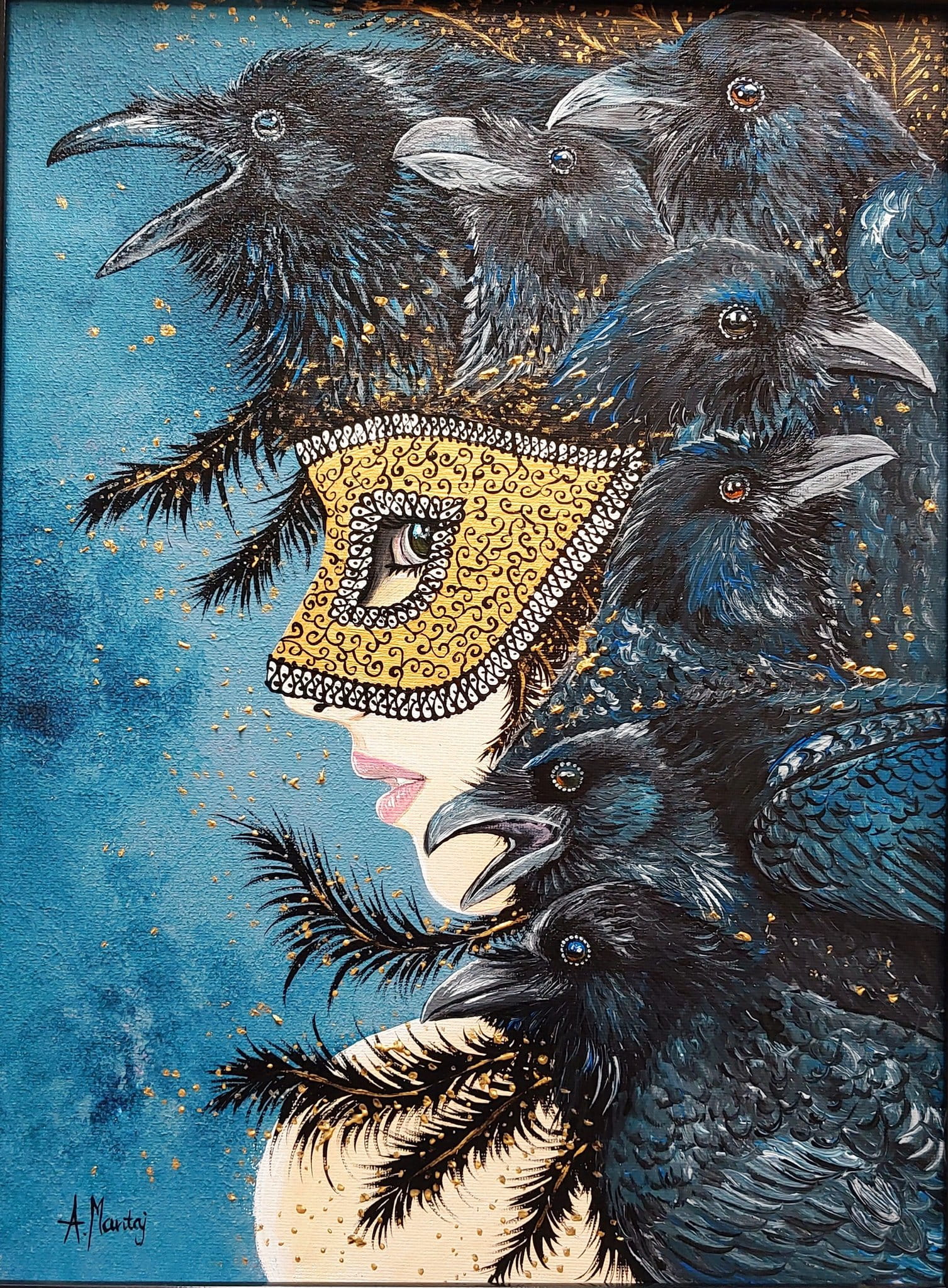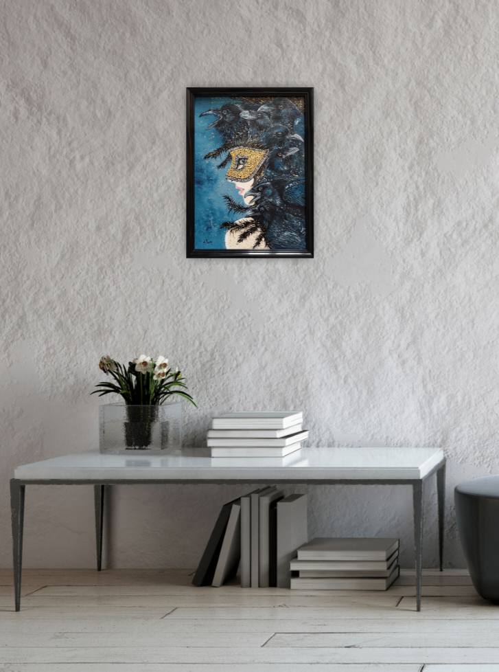 Jedyny taki, ręcznie malowany obraz Tańcząca z krukami - namalowany na płótnie o wymiarach 30x40 cm. Obraz zabezpieczony werniksem, oprawiony w czarną ramę.