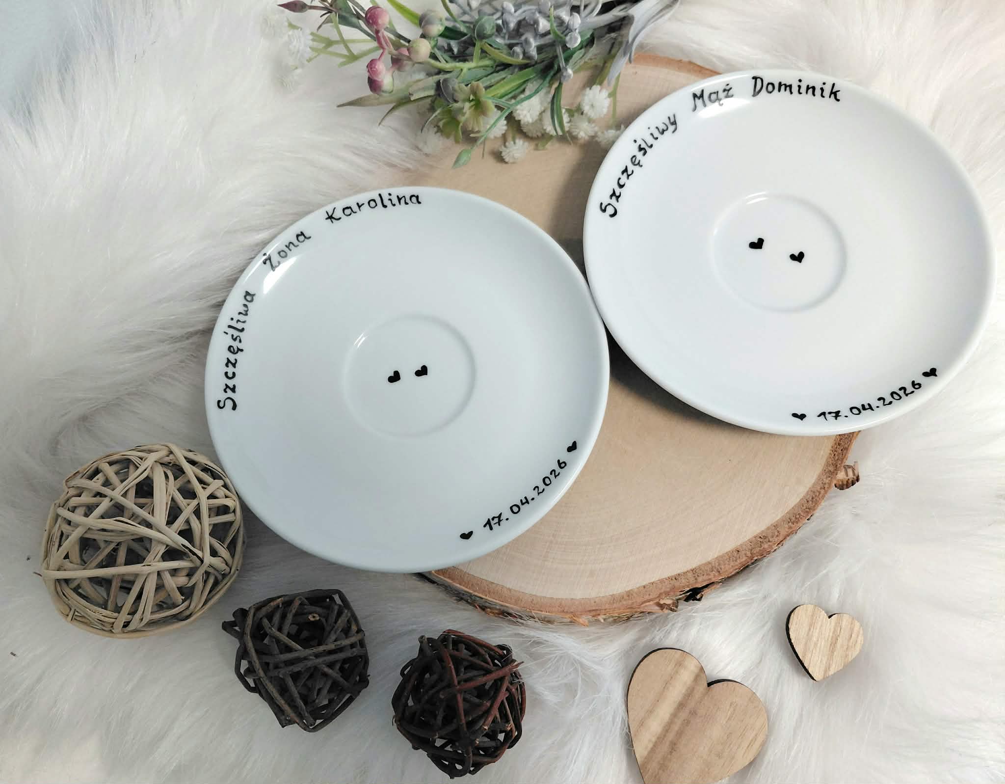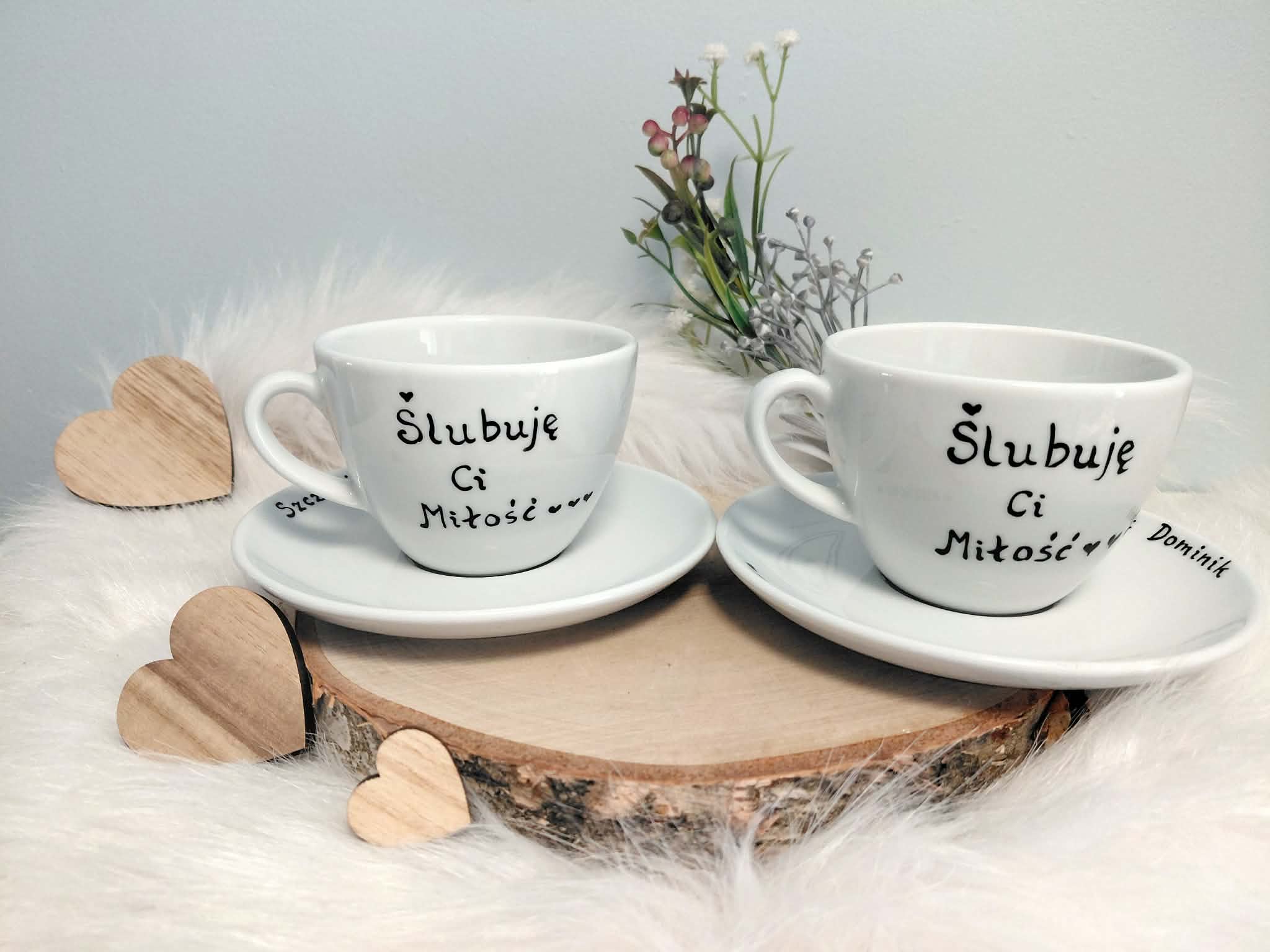 Standardowo rewers filiżanki posiada napis "Ślubuję ci miłość"