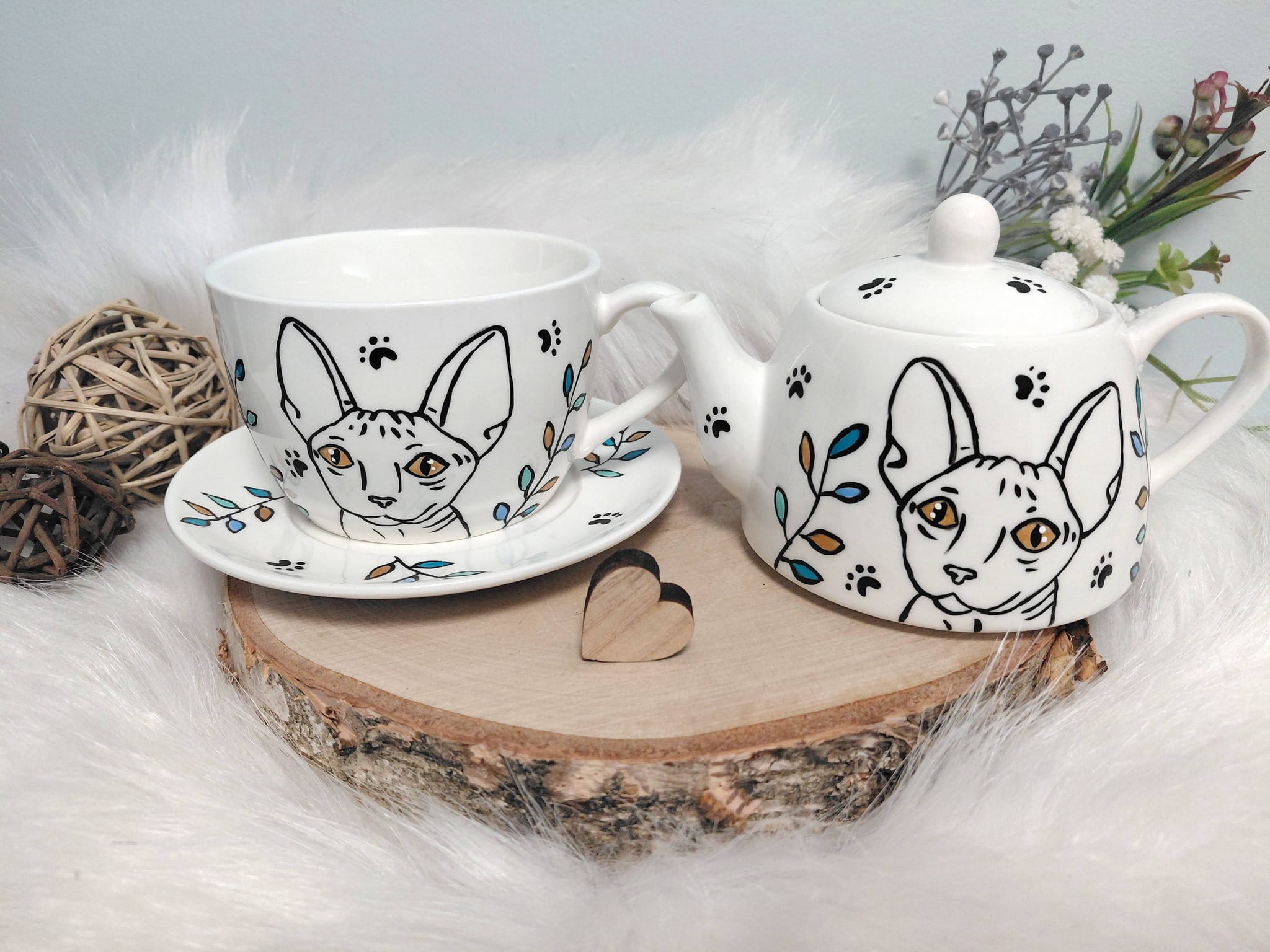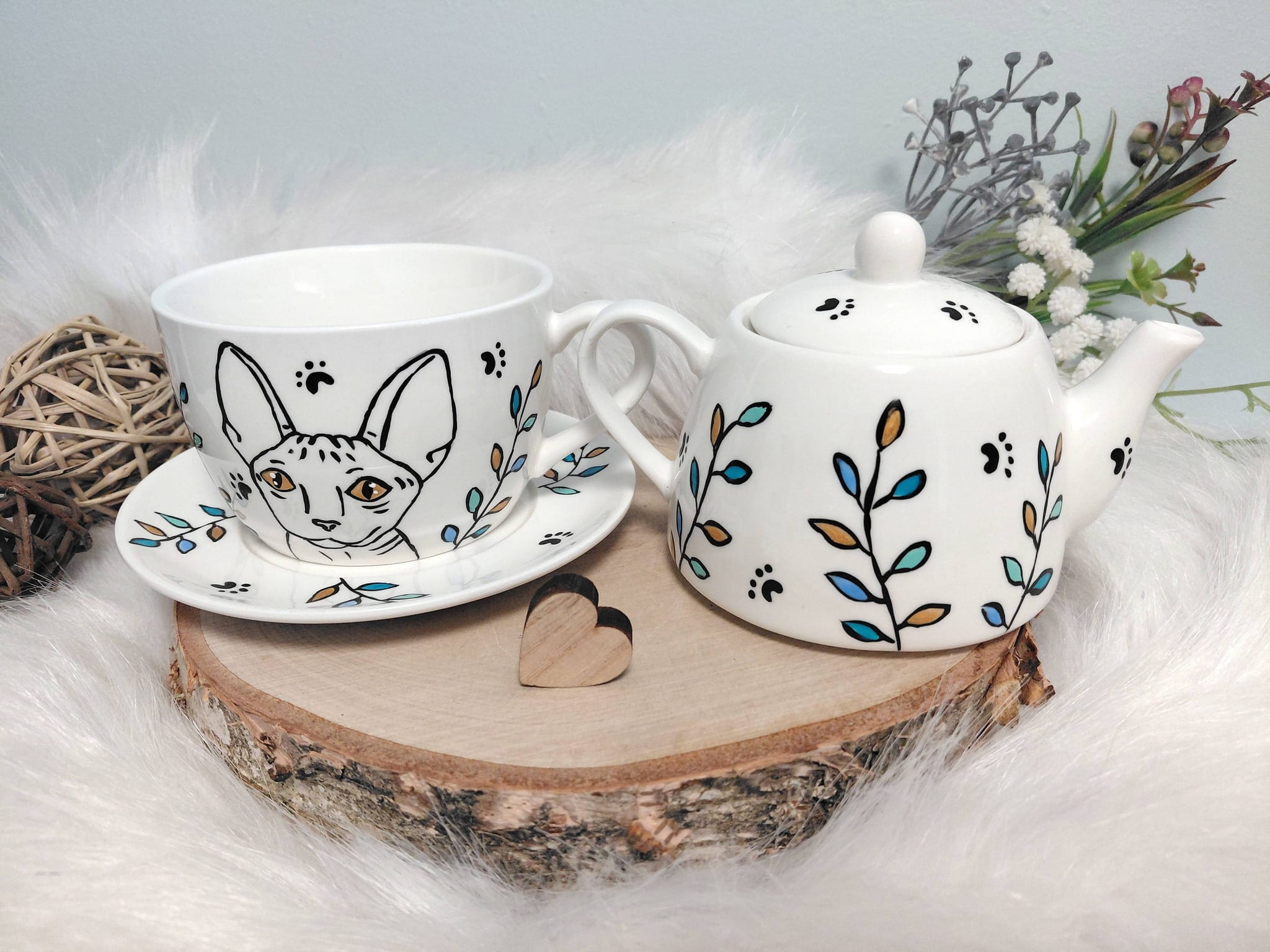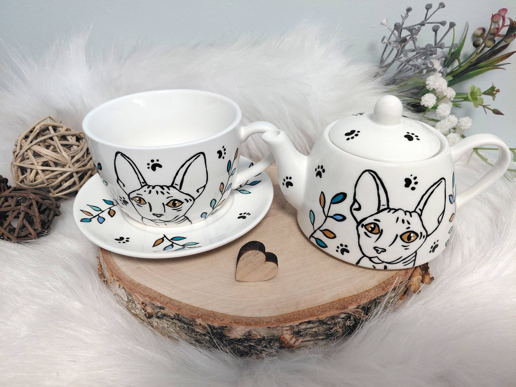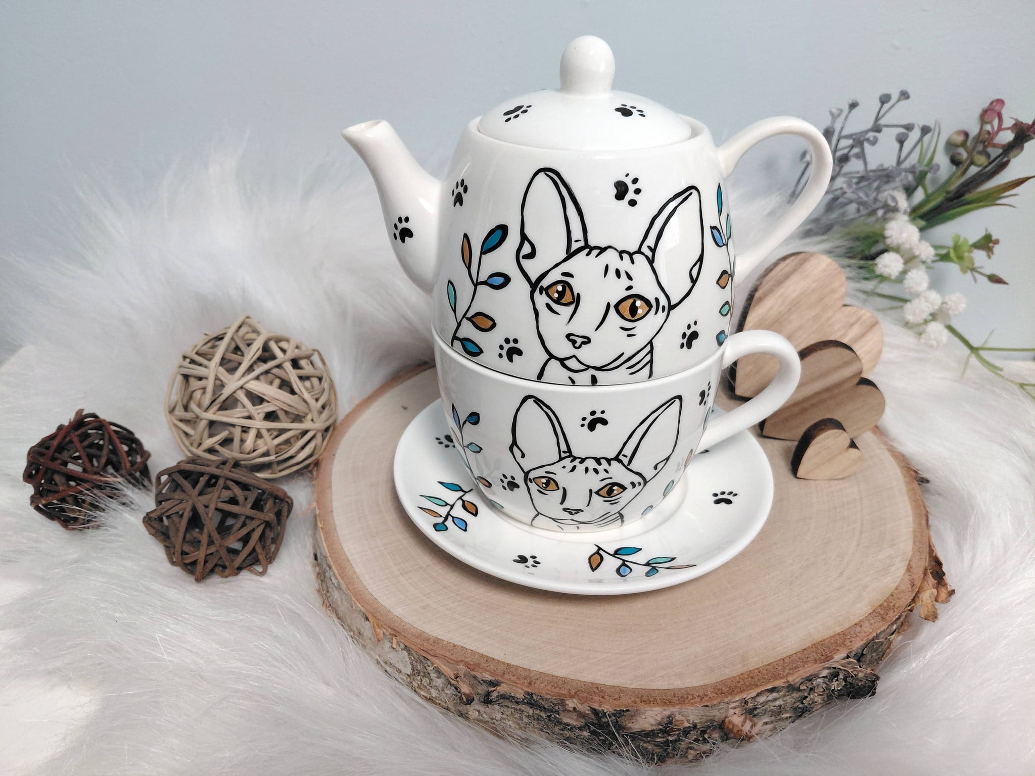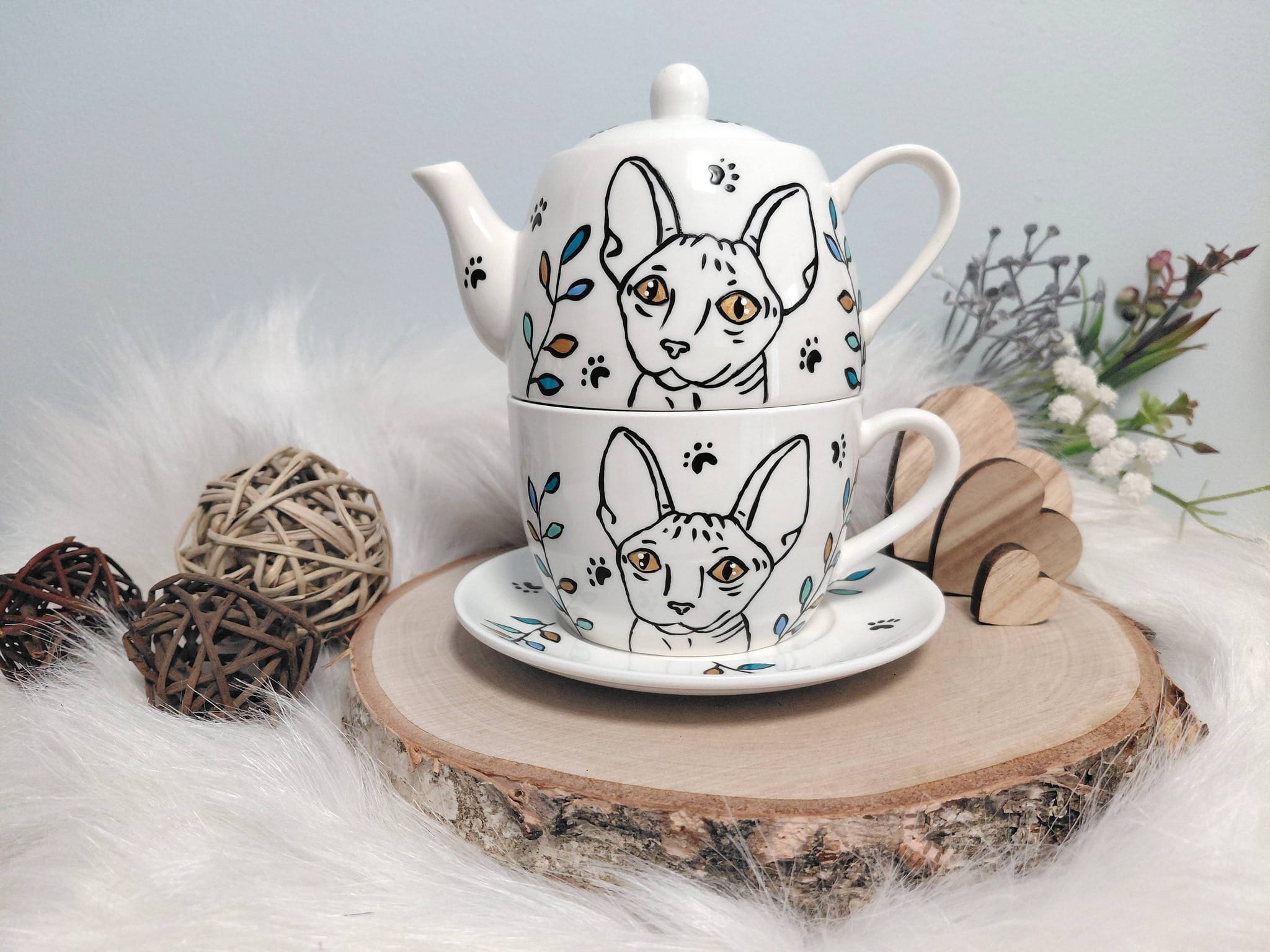 Wyjątkowy zestaw ręcznie malowany zestaw filiżanka i imbryk kot sfinks