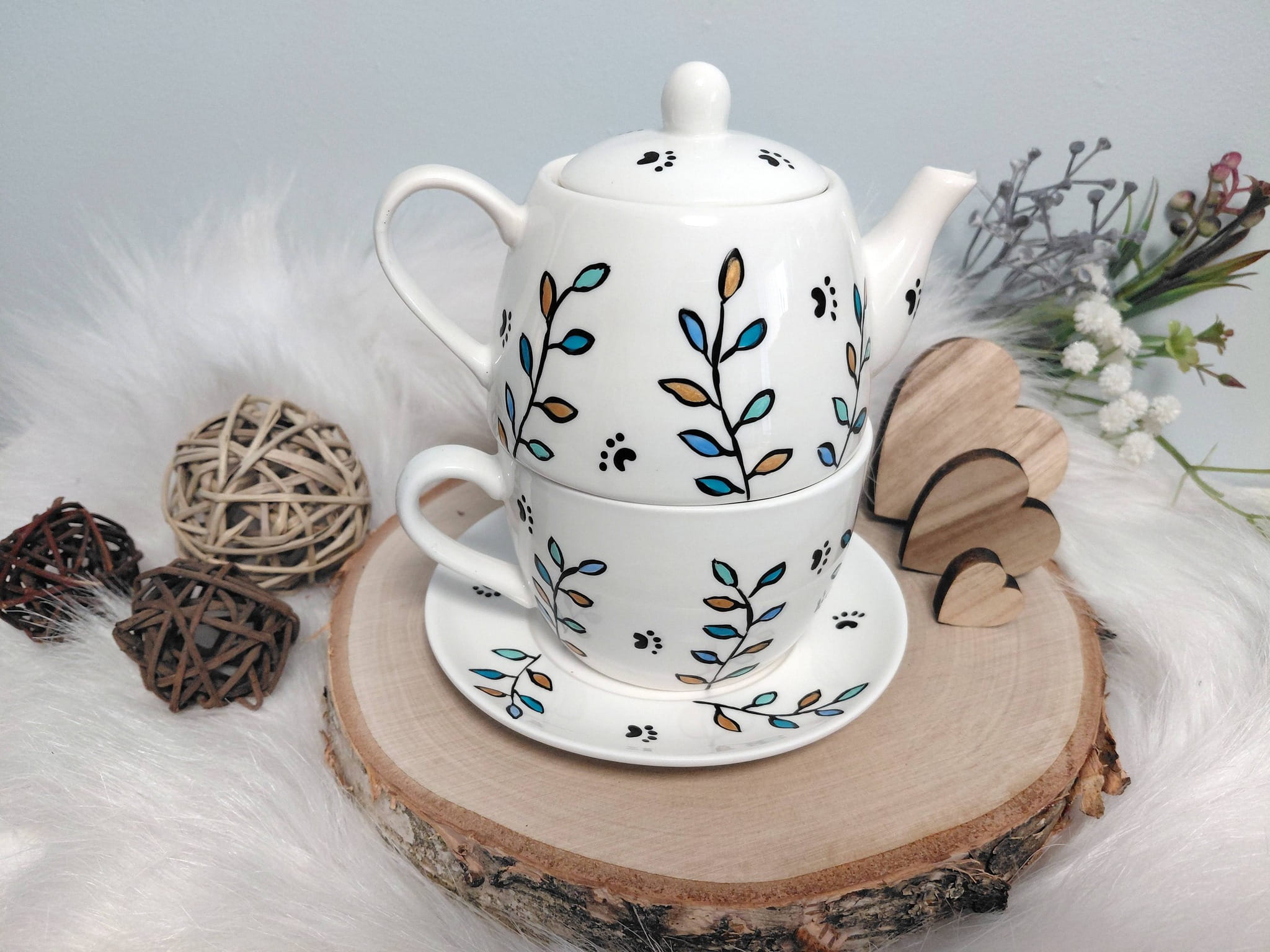 Zestaw malowany specjalistycznymi farbami do ceramiki, absolutnie bezpiecznymi, wypalany w 160 stopniach, przez co malunek jest bardzo trwały.