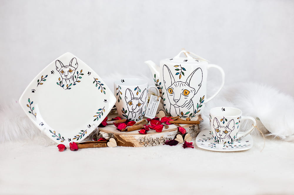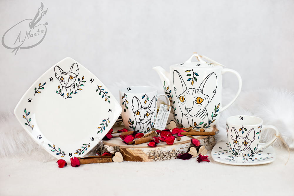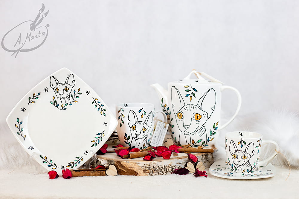 Ręcznie malowany zestaw kawowy dla dwojga Kot Sfinks