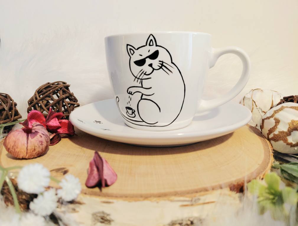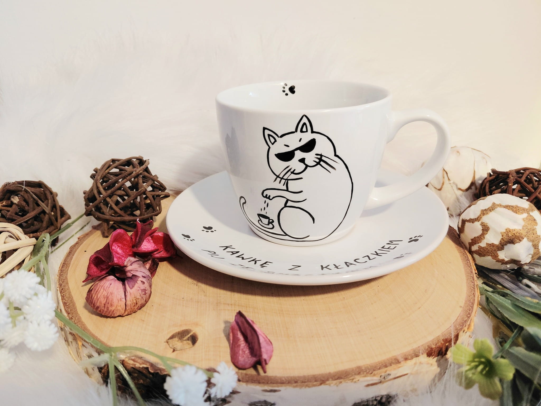 Wyjątkowa, ręcznie malowana filiżanka Kot i kawka
