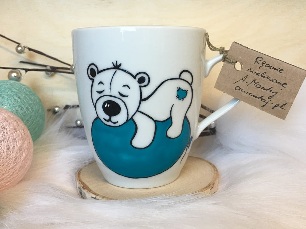Wyjątkowy, ręcznie malowany kubek z autorskim motywem śpiącego pluszowego misia.