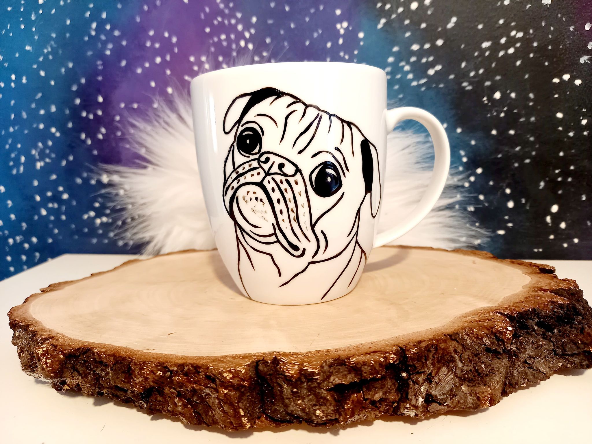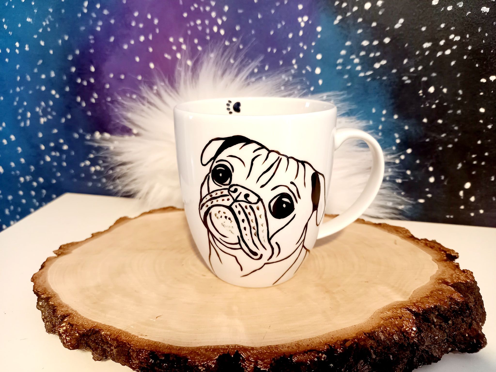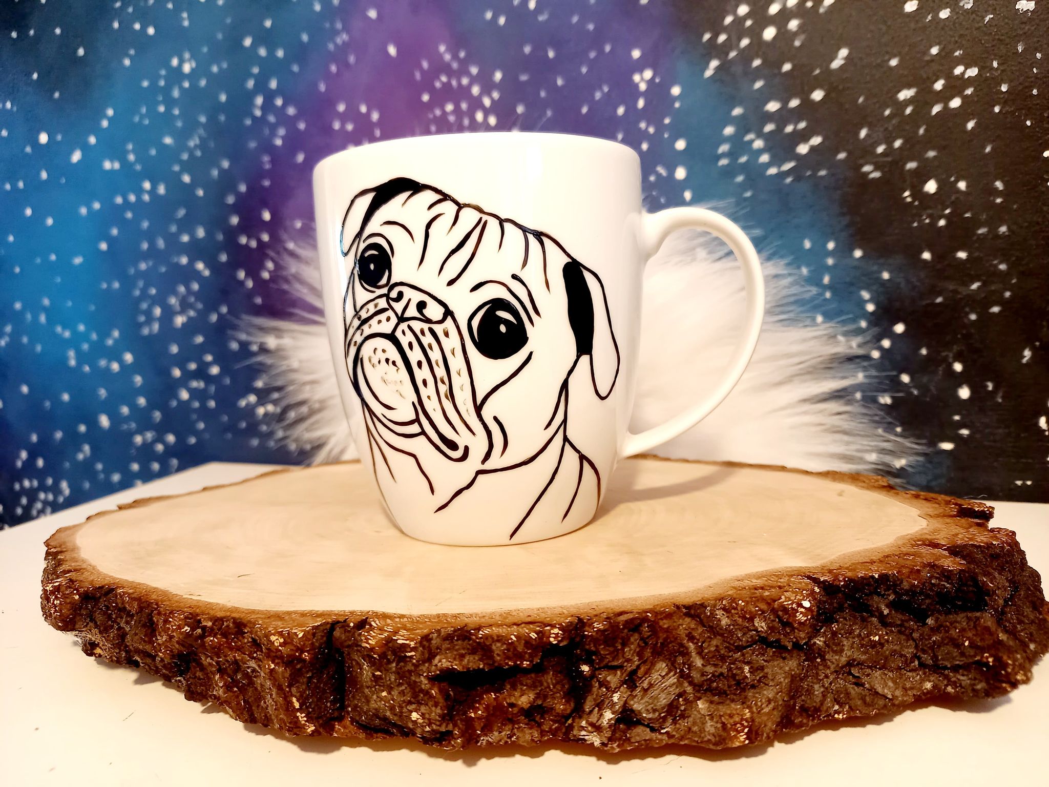 Wyjątkowy, ręcznie malowany kubek z autorskim motywem Mopsa.