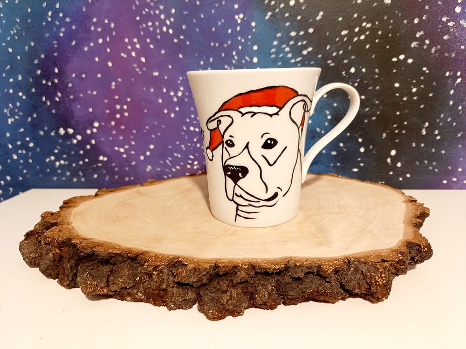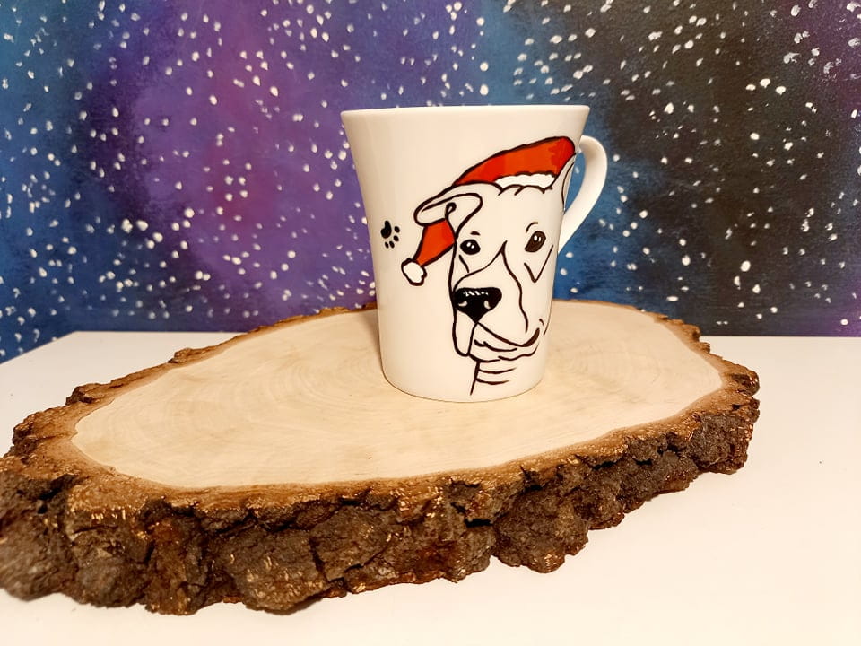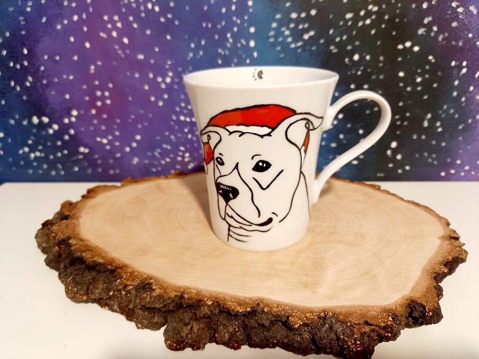 Wyjątkowy, mały, ręcznie malowany kubek Amstaff i Święta.
